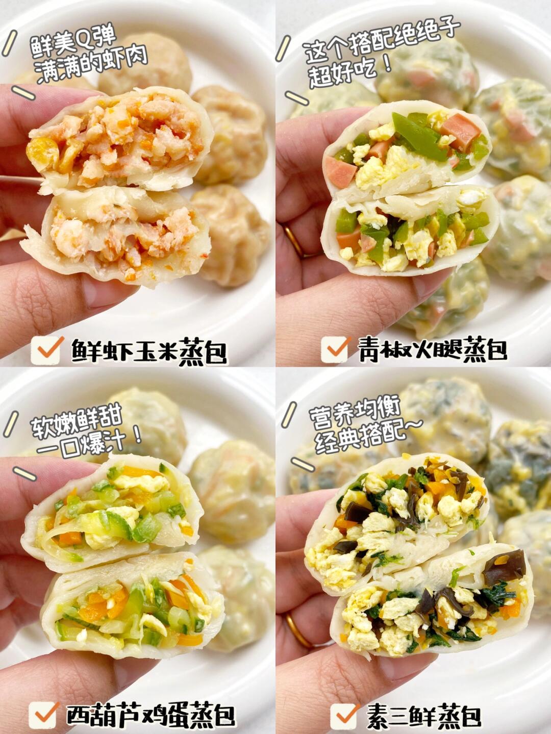 🌈今天来分享几款经常会给宝宝做的蒸包,这几个馅料都是我家百吃不厌的搭配。✨不用发酵不用揉面,做法简单快手,小小一个,一口一个好吃到停不下来,当做早餐或主食都可以,这几款馅料相信我,一定要试试呀❗️