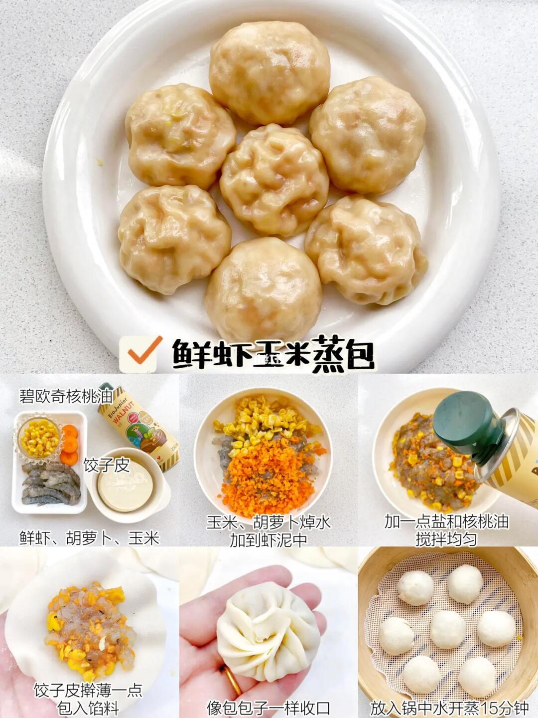 ☑️食材:鲜虾、玉米、胡萝卜、饺子皮、碧欧奇核桃油