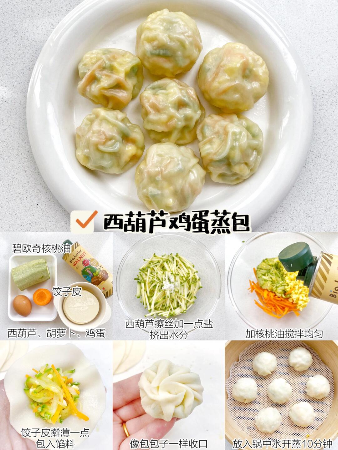 ☑️食材:西葫芦、胡萝卜、鸡蛋、饺子皮、碧欧奇核桃油