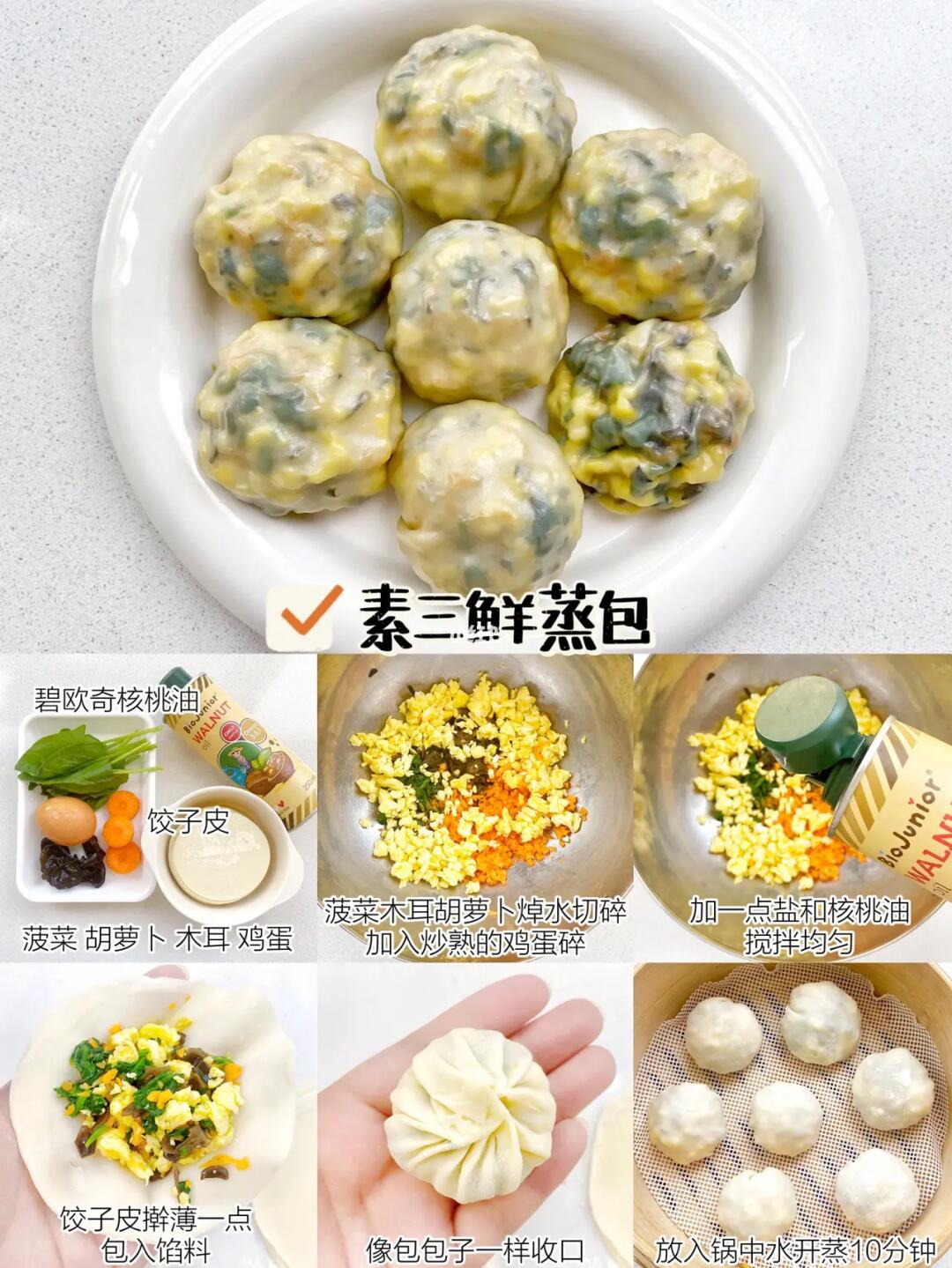 ☑️食材:菠菜、木耳、胡萝卜、鸡蛋、饺子皮、碧欧奇核桃油