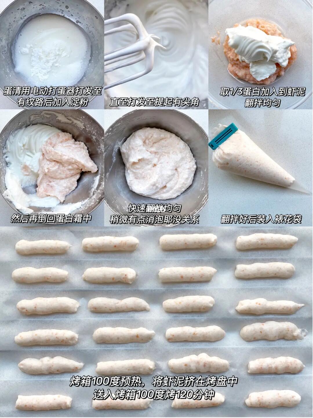 3.取1/3蛋白加入到虾泥中翻拌均匀,再全部倒入蛋白霜中,快速翻拌均匀,装进裱花袋里。