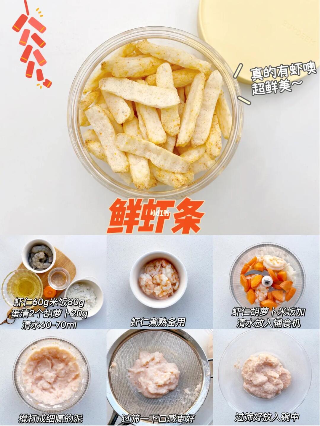 1.虾仁煮熟备用,加胡萝卜米饭清水放入辅食机搅打细腻的虾泥,过筛一下口感跟好。