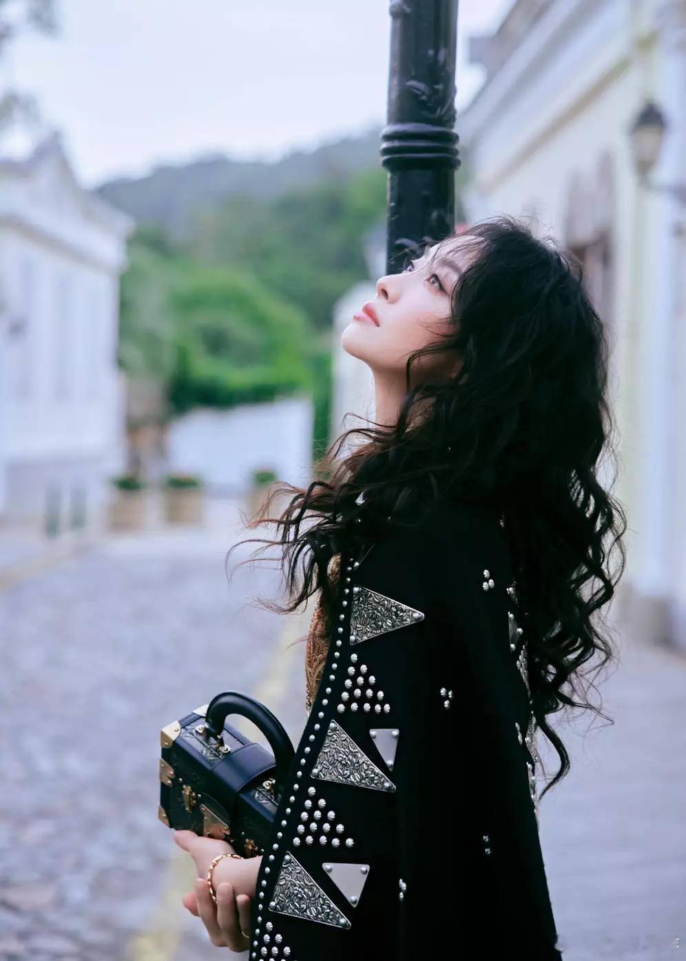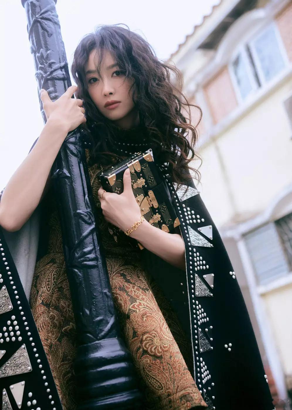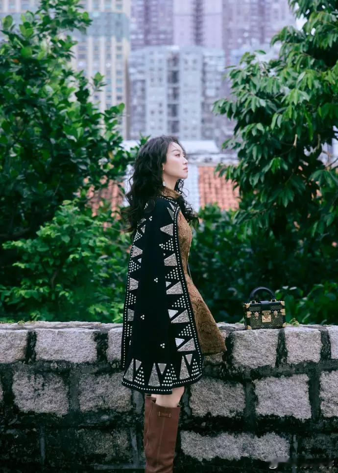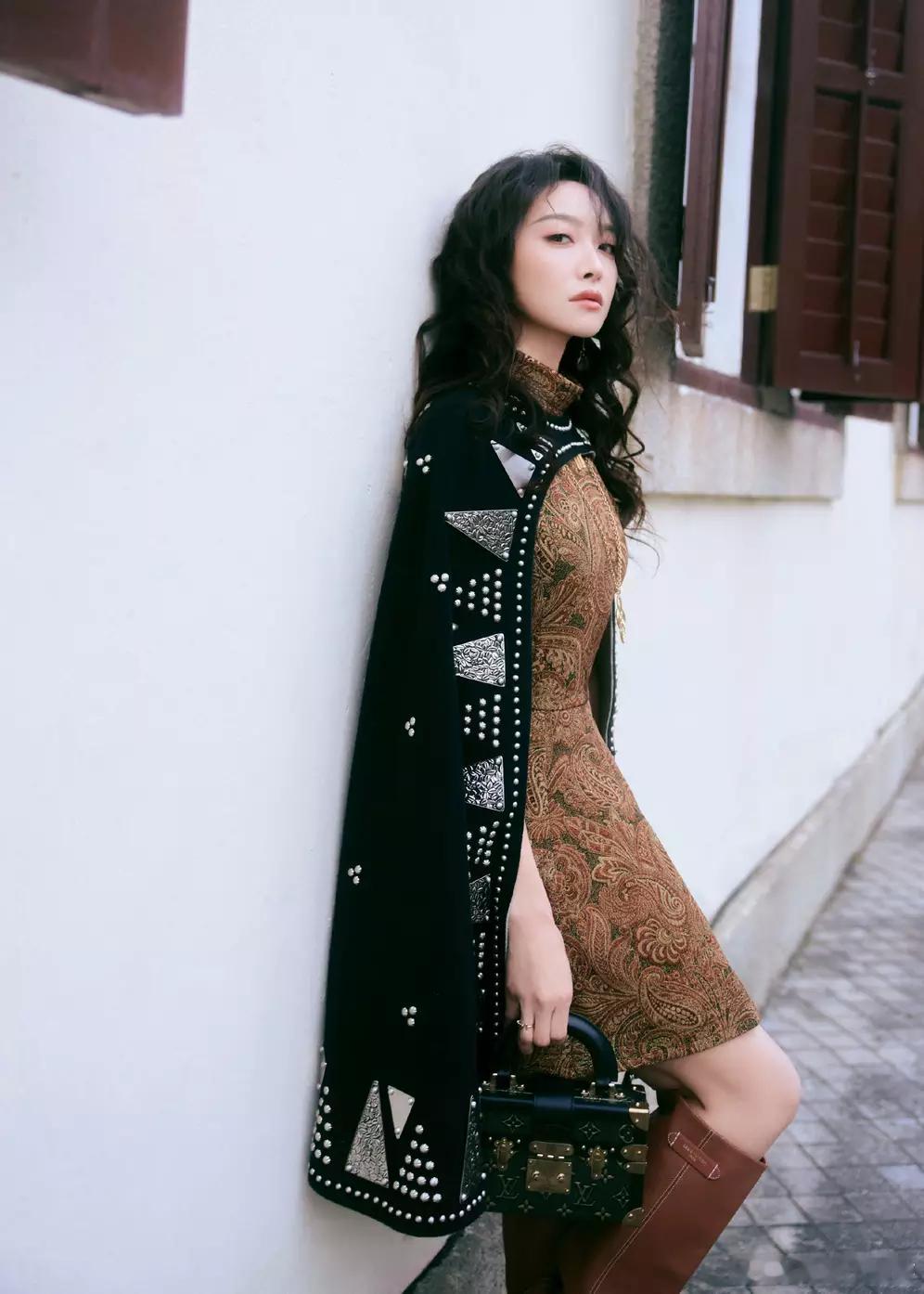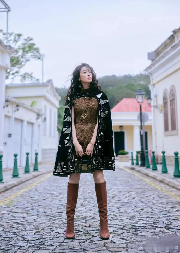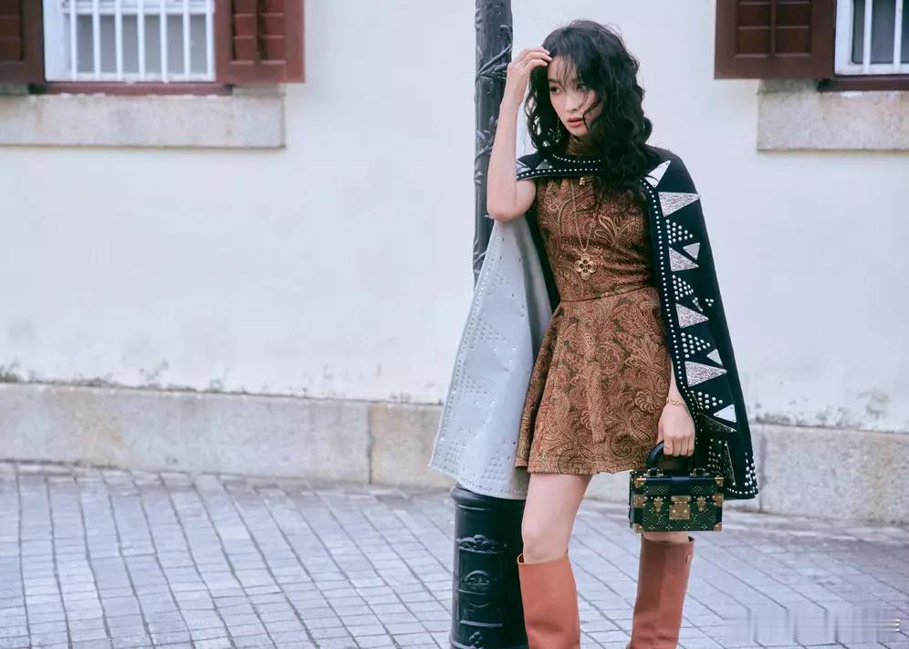 宋茜穿金色短裙装饰繁杂花纹 格纹披肩气质娴雅