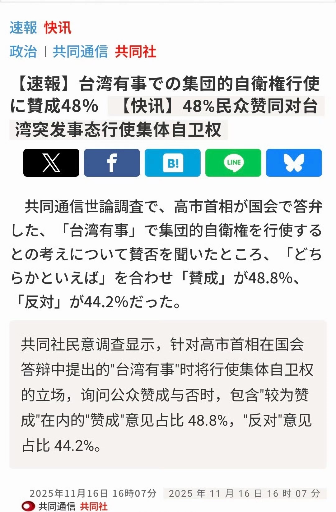 🔻日本共同社11月16日发布调查称,支持所谓“台湾有事就是日本有事”的日本人,从之前电视台调查时的82%(图1),变成了48.8%(图2)。🔻与此同时,去年盖洛普调查发布的数据中,支持“日本有事就是日本人有事”的日本人,比例是9%(图3)。