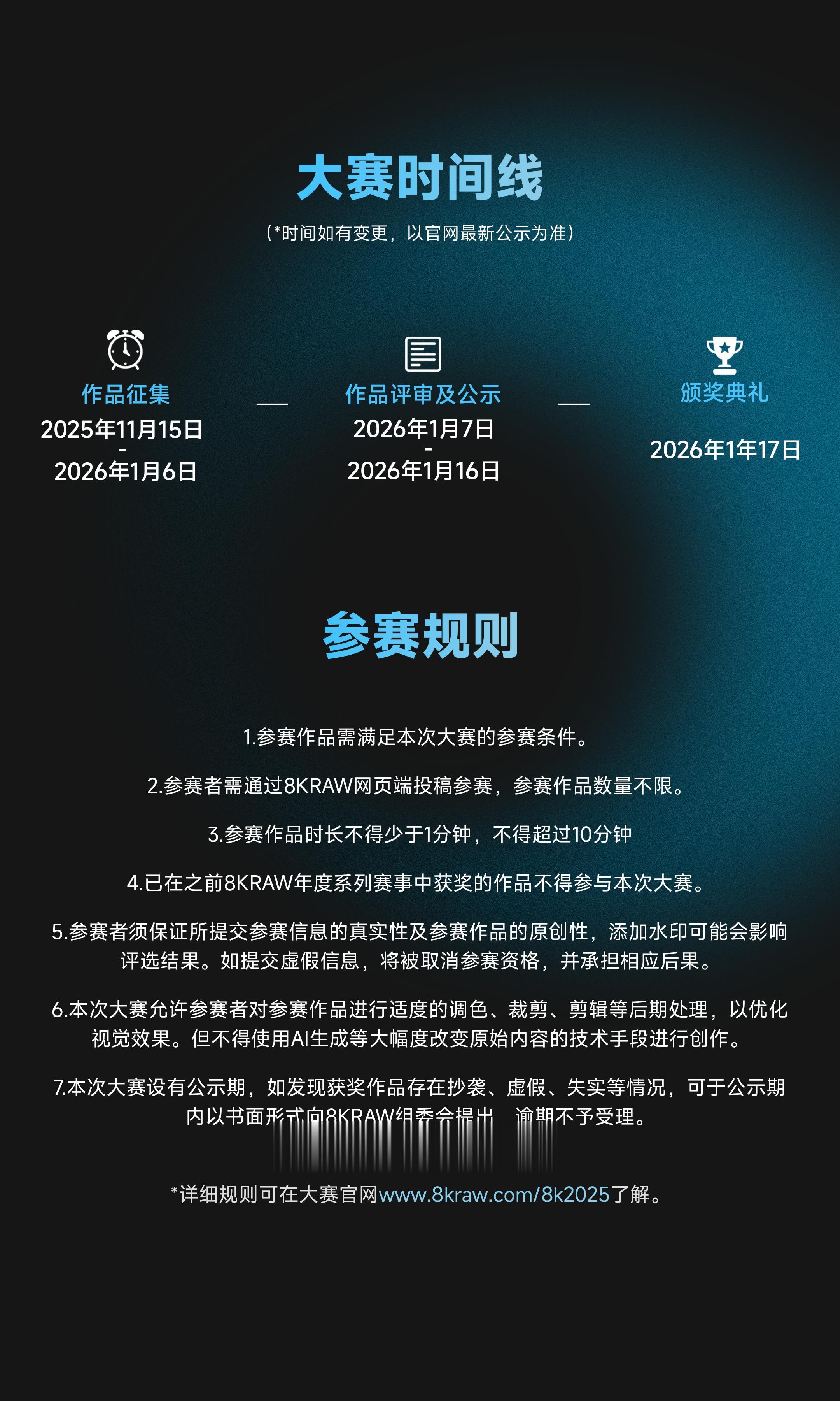29万大奖,邀你突破影像边界 | 2025 8KRAW Awards正式开赛!即日起至2026年1月6日参与大赛,即有机会赢取最高7万元奖品! 参赛入口>>>https://www.8kraw.com/8k2025 欢迎每一位影像创作者!