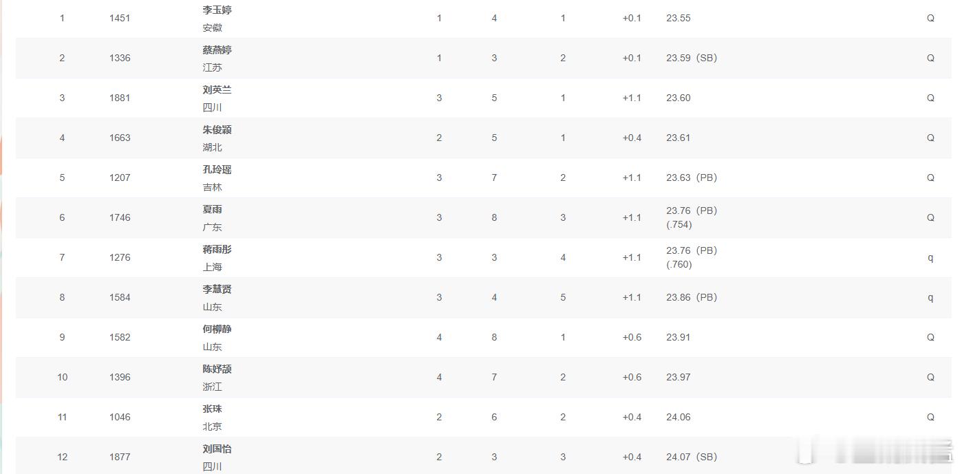 全运女200米预赛李玉婷第一位晋级 陈妤颉闲庭信步留一手到决赛 11月16日晚,全运田径大项结束女子200米预赛争夺。争冠大热、安徽选手李玉婷以23秒55排名第一。另一争冠大热陈妤颉只求小组前三晋级,无所谓成绩,她排名第十进半决赛。第一组安徽队李玉婷和江苏队蔡燕婷就拼得很猛,最终是李玉婷23秒55小组第一,蔡燕婷23秒59小组第二。第三组四川队刘英兰对阵吉林队孔玲瑶,刘英兰23秒60第一,孔玲瑶23秒63跑出个人最佳战绩排名小组第二。夺冠大热、浙江小将陈妤颉在第四组出场。由于女子200米预赛规定每小组前三直接晋级,余下选手取最快四人合并晋级。低难度预赛,陈妤颉全程轻松,近乎闲庭信步,最终排名小组第二直接晋级。预赛总排名李玉婷第一,蔡燕婷第二,刘英兰第三。陈妤颉排名第十位。半决赛将在11月18日上午10点开始进行。