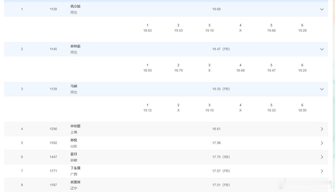 连续16年五届全运稳守第一从未被打倒 突破年龄屏障36岁巩立姣值得脱帽致敬11月16日晚,全运田径大项结束女子铅球决赛争夺,河北三将包揽前三。奥运冠军巩立姣以19米68获得冠军,个人实现全运会五连冠。前四届全运会的夺冠成绩分别是:2009年的20米35;2013年的19米75;2017年的19米46和2021年的19米88。虽然已经36岁高龄,但巩立姣现在的成绩,也没有退步多少。五次有效成绩里,四次过了19米,两次过了19米50,最后以第五次的19米68荣耀夺冠。拿下冠军后,巩立姣振臂高呼庆祝。非常非常不容易,投掷运动虽然不用像跑步那样讲究速度爆发,30岁就瓶颈,但也是吃青春饭的项目。巩立姣从2005年、16岁开始就参加国内一线专业赛事至今,莫说外国对手,国内对手就不知道换了多少茬,在最重要的全运会上,连续五届16年稳守第一,中国田径活化石选手巩立姣,值得每个田径迷脱帽致敬。当然,今天的夺冠比赛,可能也是巩立姣五次夺冠战役里最难的一次,两位队友给了她很大麻烦。张林茹和马越都在本场比赛创造个人新高,张林茹的19米47,马越的19米33,巩立姣鼎盛期这种成绩不算啥,但放在当下,还是有相当威慑力的。还好今年有过19米79发挥的巩立姣,底限实力依然能保证在国内的领先。巩立姣靠着天赋,更靠科学的训练和远超常人的耐心和恒心,远远突破年龄屏障,在一个冷门项目,硬生生开辟出自己的传奇之道,对于生活在这个时代、努力想有所成就的我们,有着很大的启发和激励作用。