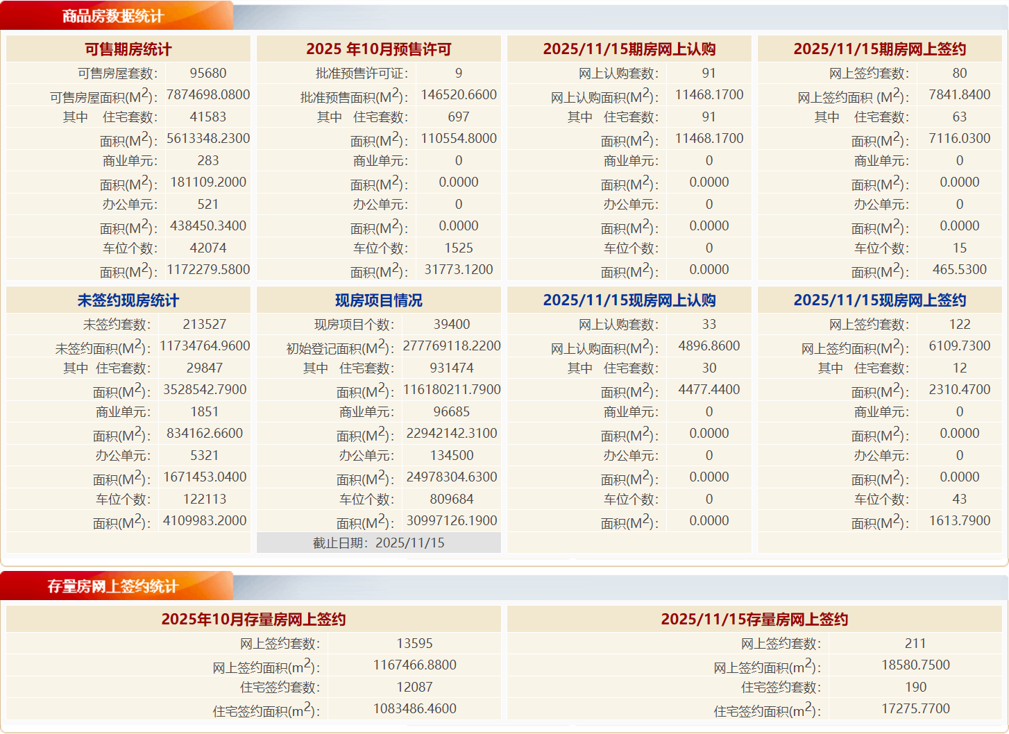 根据北京市住房和城乡建设委员会数据:11月15日,北京新房住宅网签75套,网签面积约9,426.5㎡;二手房住宅网签190套,网签面积约17275.77㎡。