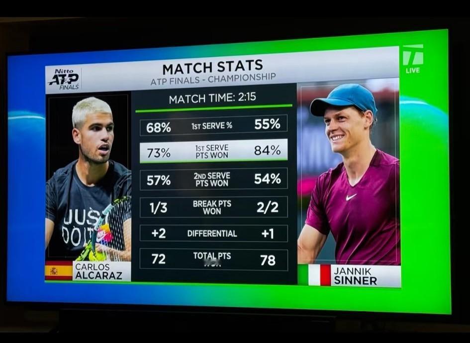 辛纳仅用时2小时15分钟,就以7:6、7:5总比分2:0轻松击败阿卡,夺得本年度总决赛的冠军和500多万的巨奖。 今天两位球员在场上的表现,可以说是这项赛事开赛以来最差的一场,看看双方的数据就知道了,特别是辛纳55%的一发进球率。可即便如此,他还是以2:0拿下了比赛,这是为什么呢?因为阿卡比他打的还臭。正手进攻和放网前在辛纳面前屡屡失效,最后也只有输的份了。 本赛季共六次辛卡决,阿卡赢下了罗马大师赛、辛辛那提大师赛、法网和美网四次,辛纳赢了温网和年终总决赛,在奖金数量上可能差不多吧!
