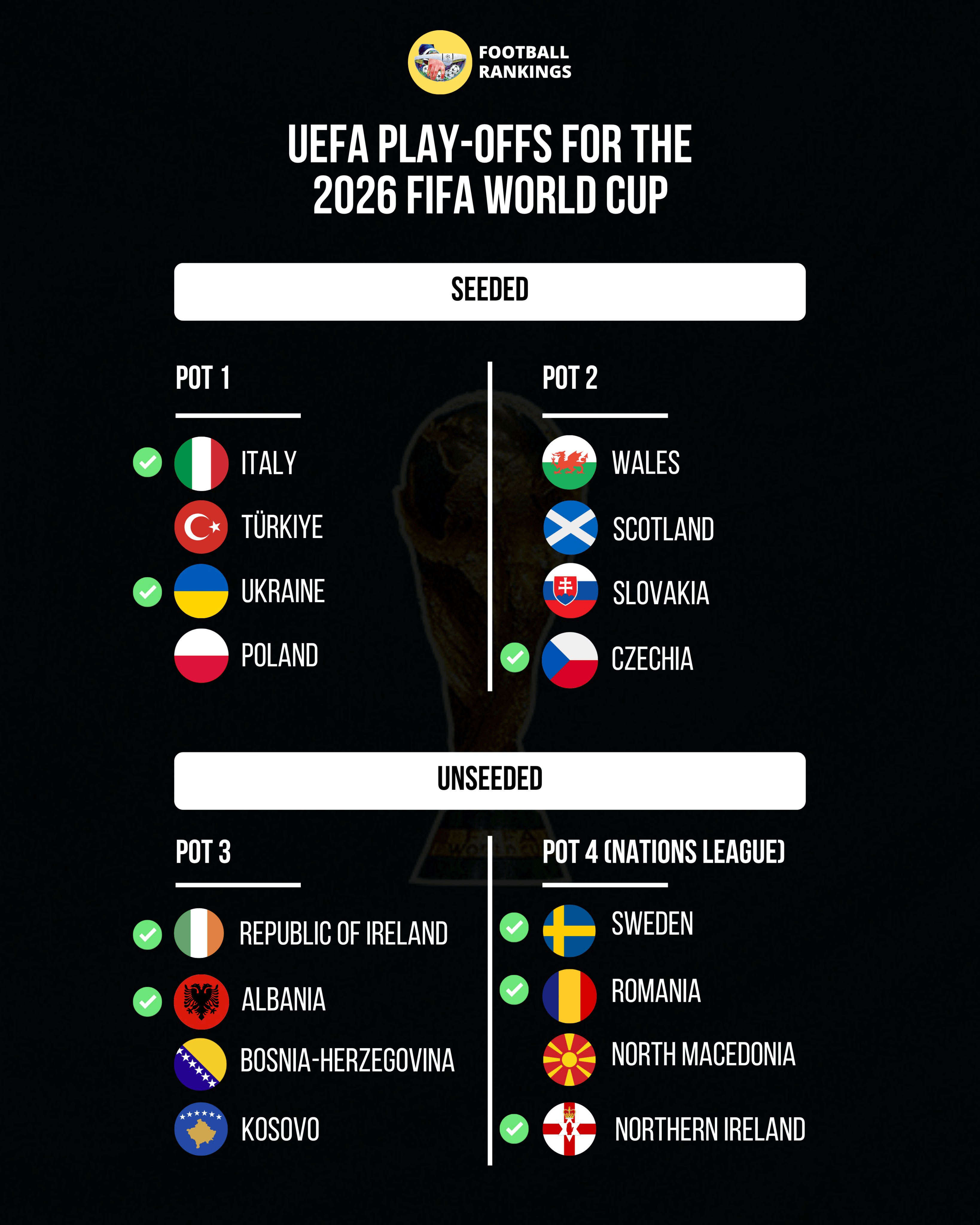 按照目前各队的积分情况估算(其中8队已确定参加附加赛,其他几队是否决定参加附加赛则将在末轮结束争夺后决定),意大利、土耳其、乌克兰、波兰将成为附加赛中的第一档球队,威尔士、苏格兰、斯洛伐克、捷克将成为第二档,爱尔兰、阿尔巴尼亚、波黑、科索沃成为第三档。
