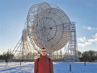 研究人员站在英国约德雷尔班克射电天文台的洛弗尔望远镜前。图片