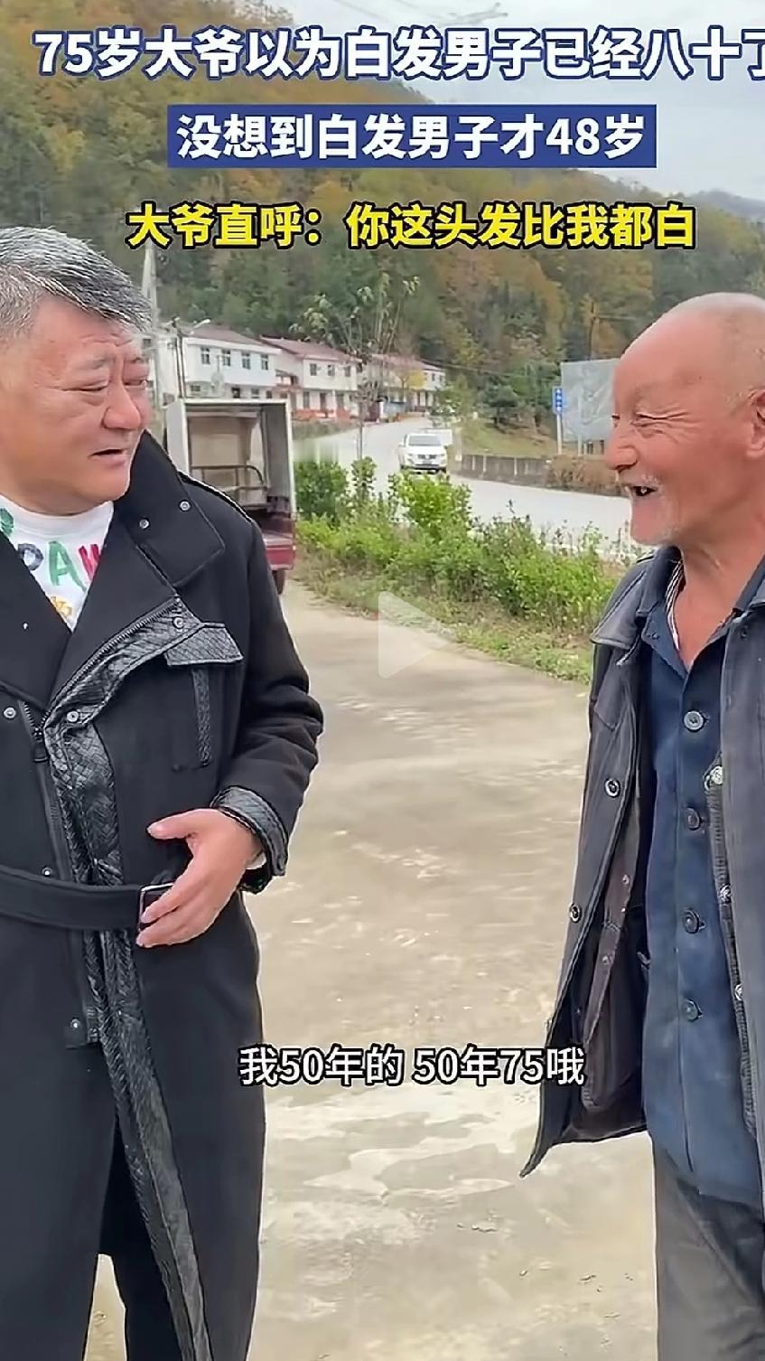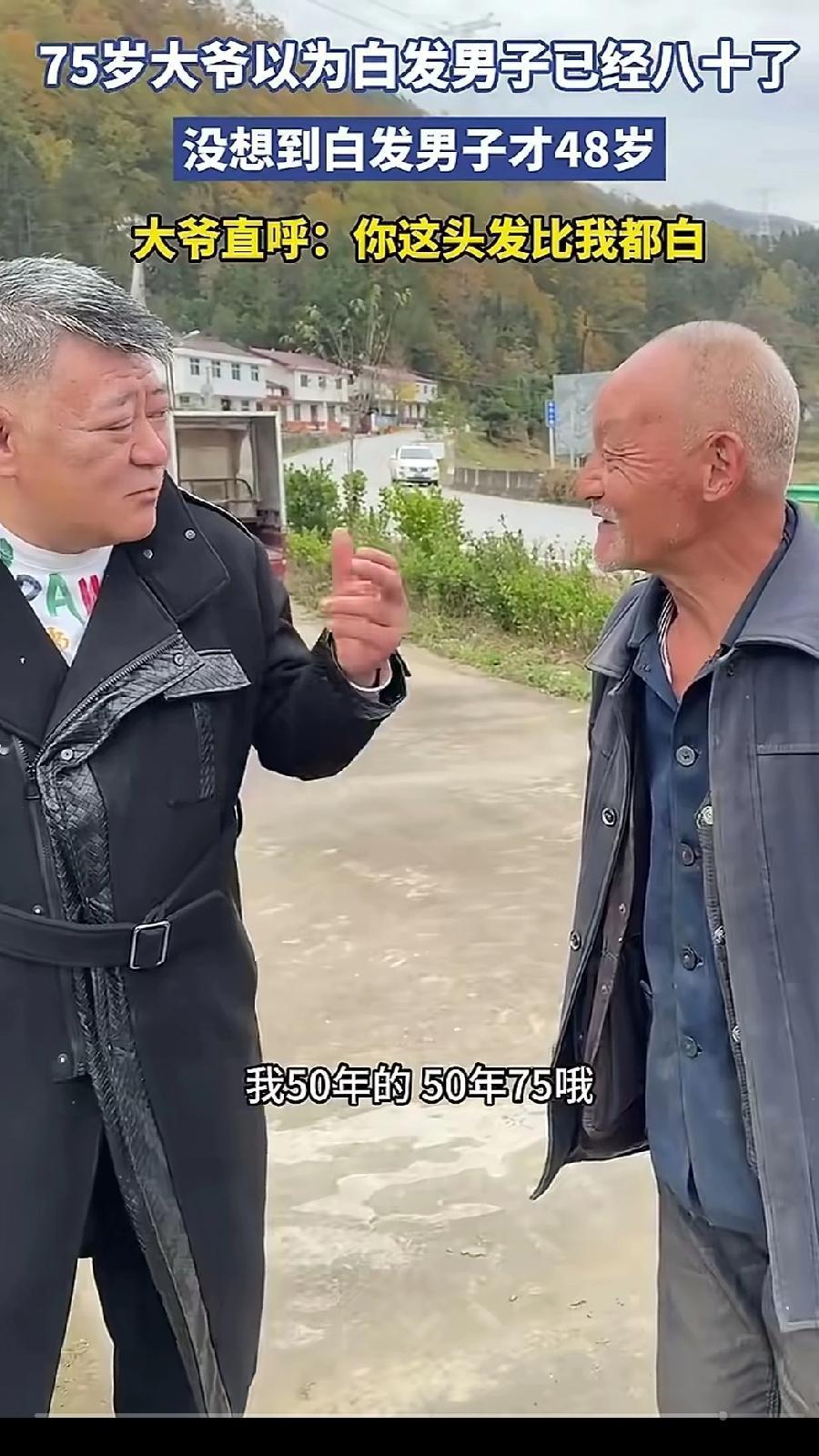 75岁大爷以为白发男子八十了,没想到男子才48岁,大爷一番话把男子问愣了,自己有那么老吗?男子挺伤心的,让人误以为是八十岁的老人,在男子面前大爷很自豪,因为他的白发比男子少,快乐就这么简单[捂脸] 白发对有的人来说证明不了年龄,也许是经历的事太多又或许操心受累,只不过是显露在了头发上,有的人年纪轻轻就满头白发,也许和遗传基因有关,头发黑白只要身体健康就好!