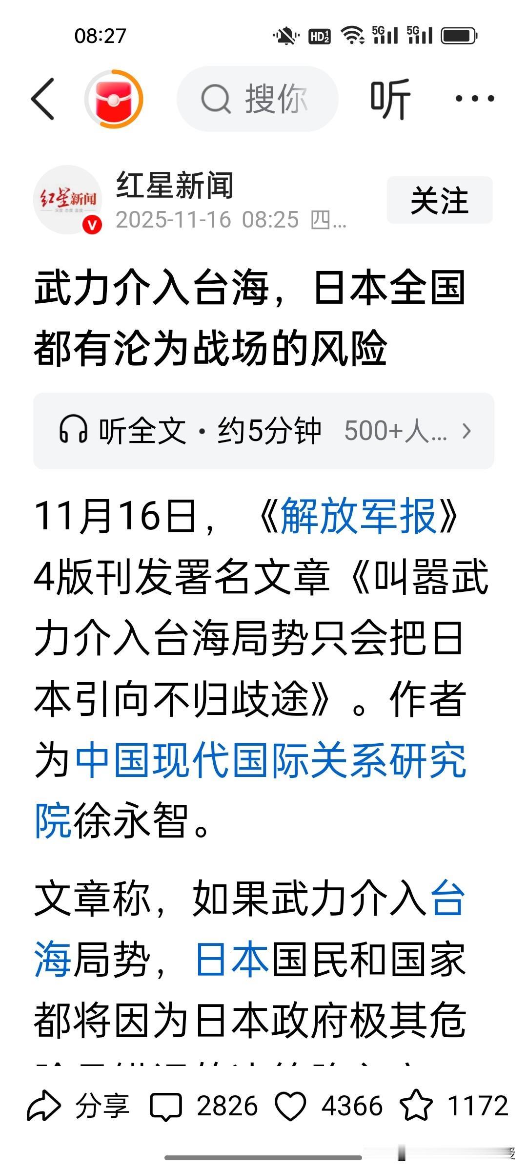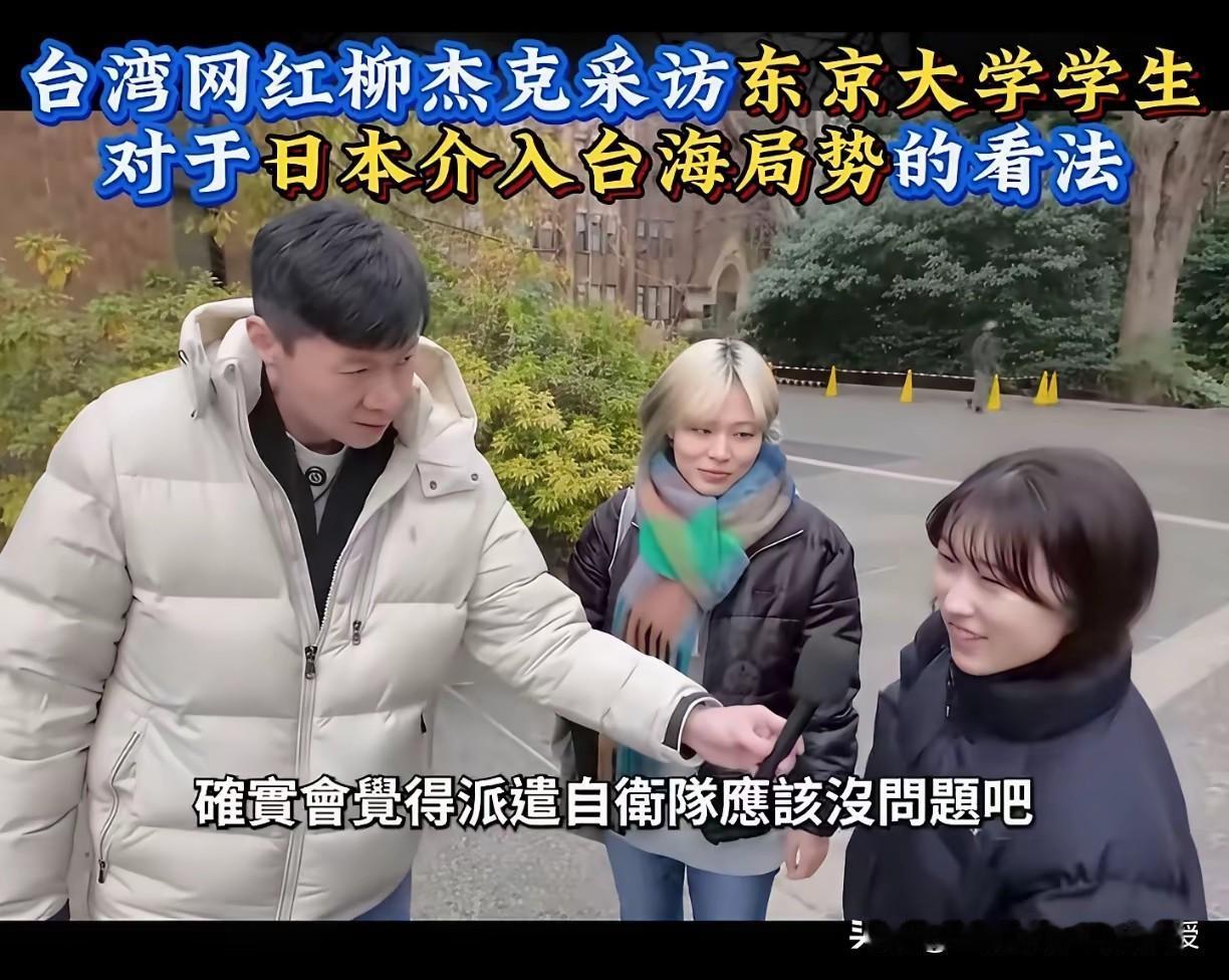 看下图,确实想不到,东京大学的学生跟日本政客的想法出奇一致。说明日本从教育的根源上就有问题。 台湾网红柳杰克采访了几位东京大学的日本学生,他们说完全可以接受日本派遣自卫队,支持日本政府帮助台湾。 这几个日本学生的说辞竟然几乎一致,这可不是日本右翼势力抬头这么简单,再结合近期高市早苗在18-29岁年轻人的支持率高达82%,83%的日本人支持日本武力介入台海局势。这就说明日本的教育在学生价值观塑造上就是向着极右的思潮上培养的。日本人民都是爱好和平只是掩盖多年的假象。 《解放军报》一点不客气,发文称“武力介入台海,日本全国都有沦为战场的风险”,这可不是打嘴仗,中国军队说得出就做得到,别把中方的警告当空话,介入台海的那一刻,就是日本灾难的开端!