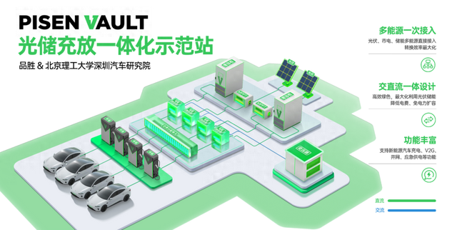 如果说超充技术解决了“补能快”的痛点,储能创新则破解了“供能稳”的难题。此次高交会上,品胜首发的“PISENVAULT光储兆瓦超充站”,以“绿电直供+智能储能”双核心设计,重新定义超充站运营模式。这款集成化新品并非单一设备,而是一套涵盖光伏接入、储能调峰、智能充电的全场景解决方案。
