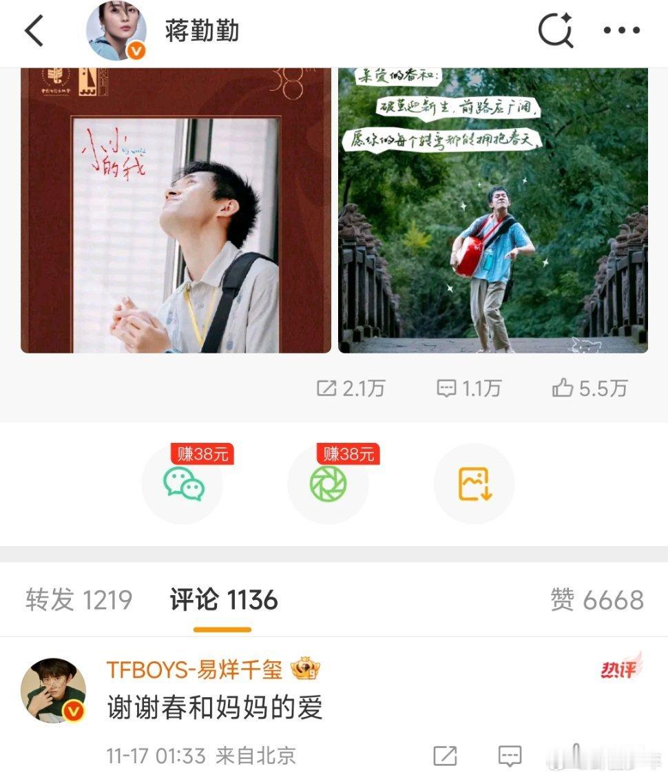 . 蒋勤勤以"春和妈妈"身份祝贺易烊千玺获金鸡奖最佳男主,千玺暖心回应"谢谢春和