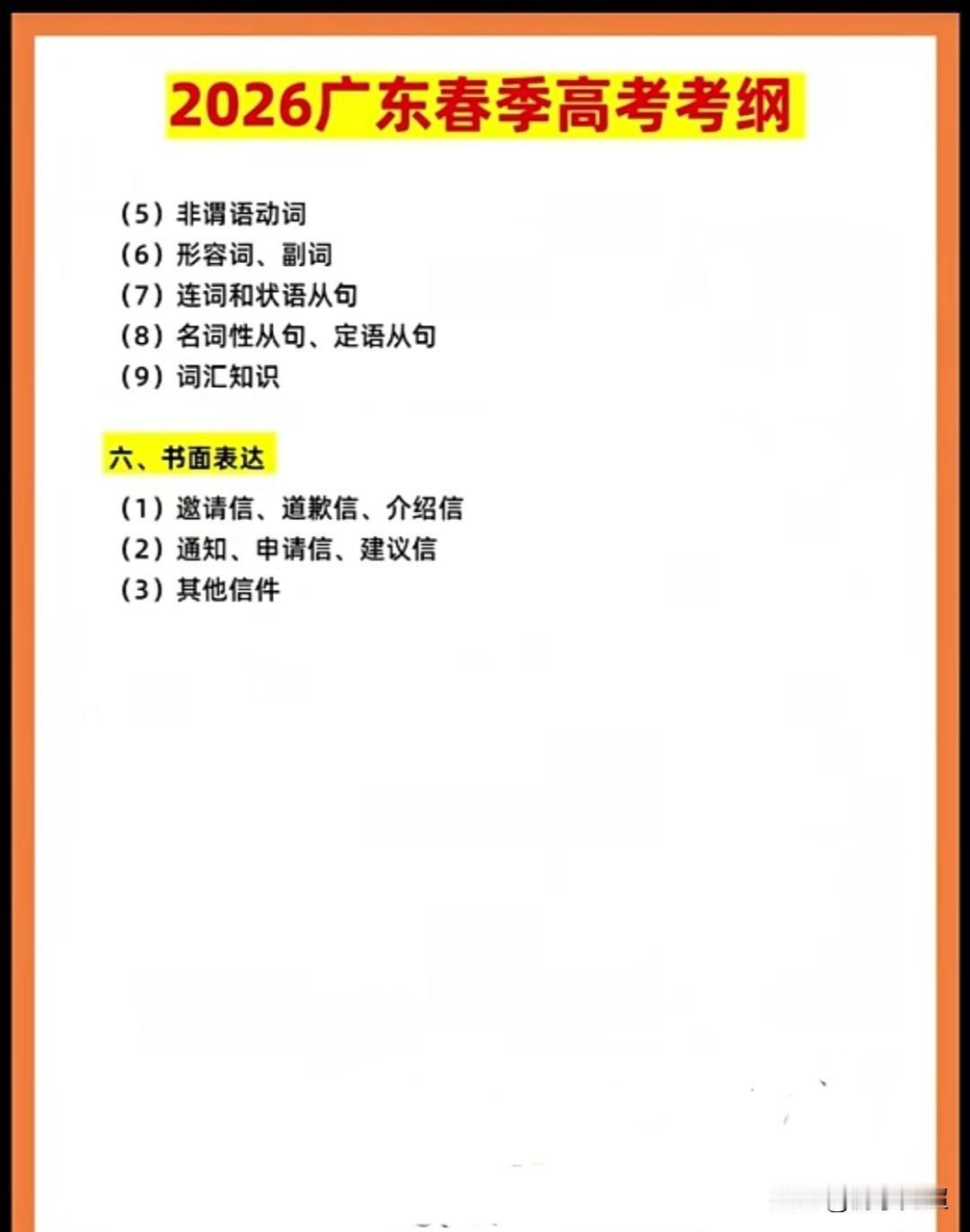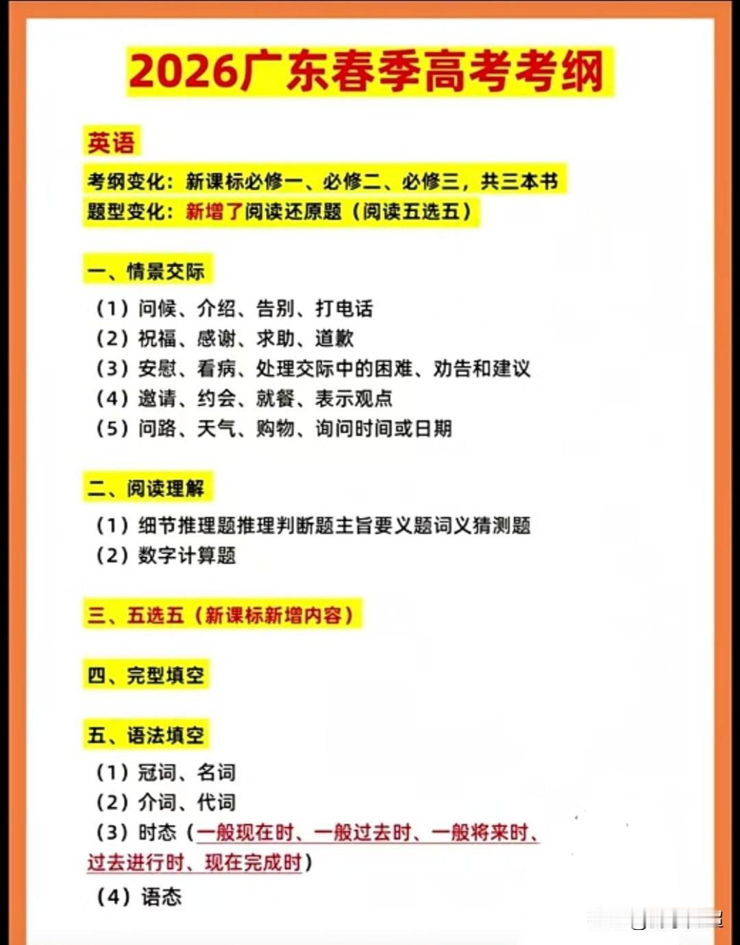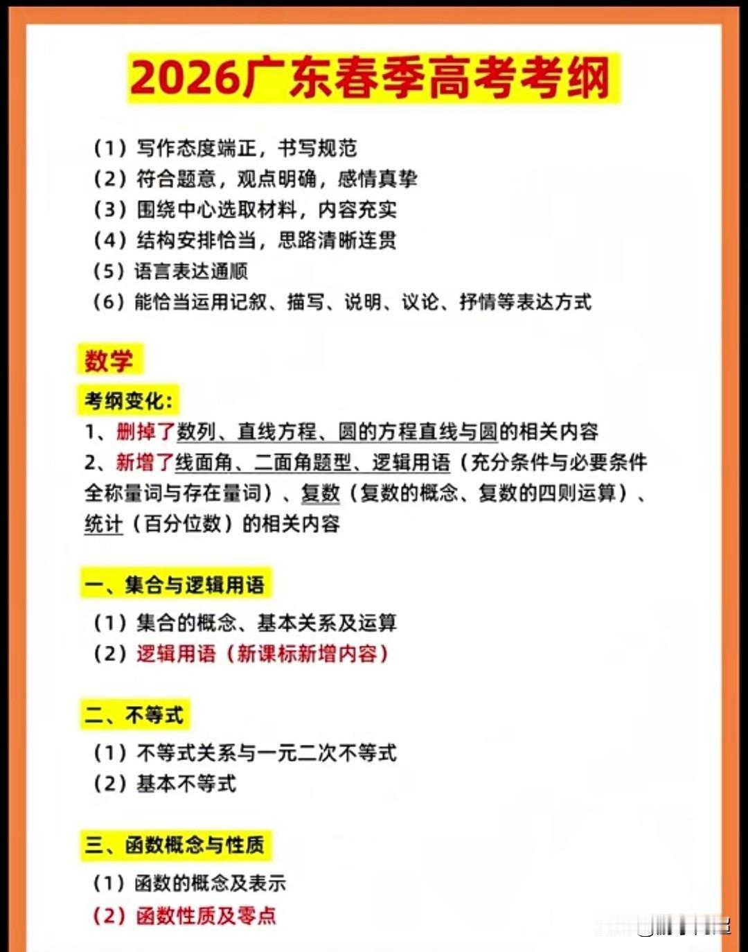 广东省2026年春季高考考纲范围及变化汇总。 广东省2026年春季高考时间拟定于2026年1月8日至10日,仅考语文、数学、英语三科。 不过今年广东春季高考这三科的考纲范围均有变动,既有删减部分,也有新增内容。详细情况可参考下图,可依据考纲内容展开复习。 春季高考难度不大,只要掌握方法,定能以高分上岸。
