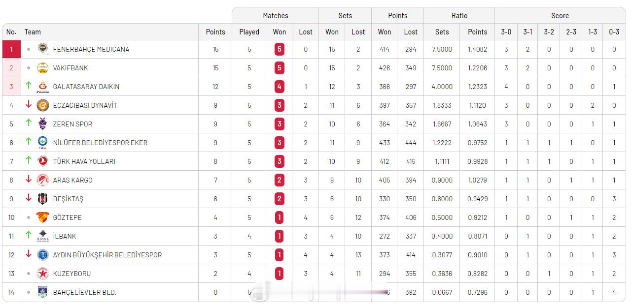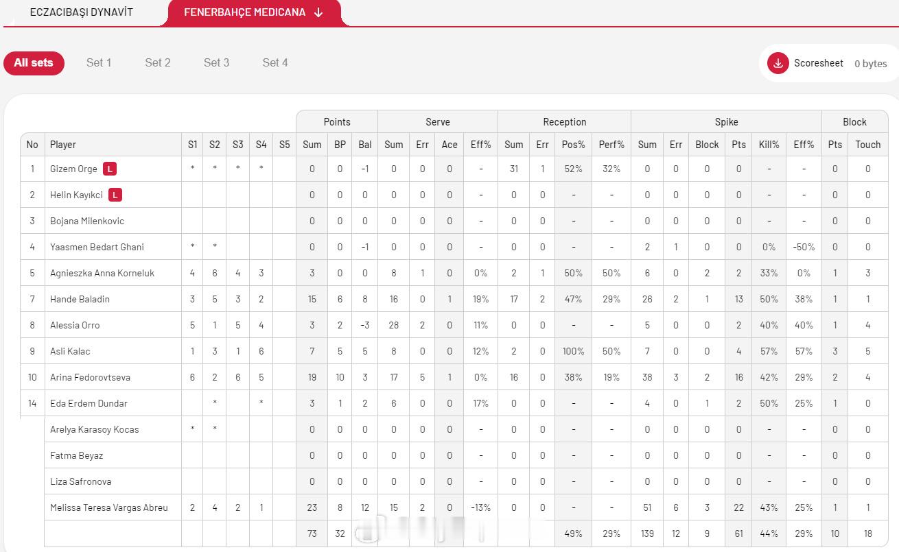 【土超女排焦点战:伊萨1-3费内巴切】 11月16日伊斯坦布尔,土超女排第五轮焦点战,伊萨奇巴希主场1-3(13-25/25-21/15-25/26-28)不敌费内巴切,3胜2负积9分排名联赛第四,费内巴切五连胜15分位列榜首。斯蒂西亚克25分、卡拉库尔特13分,巴尔加斯23分、费多罗夫采娃19分、巴拉丁15分。