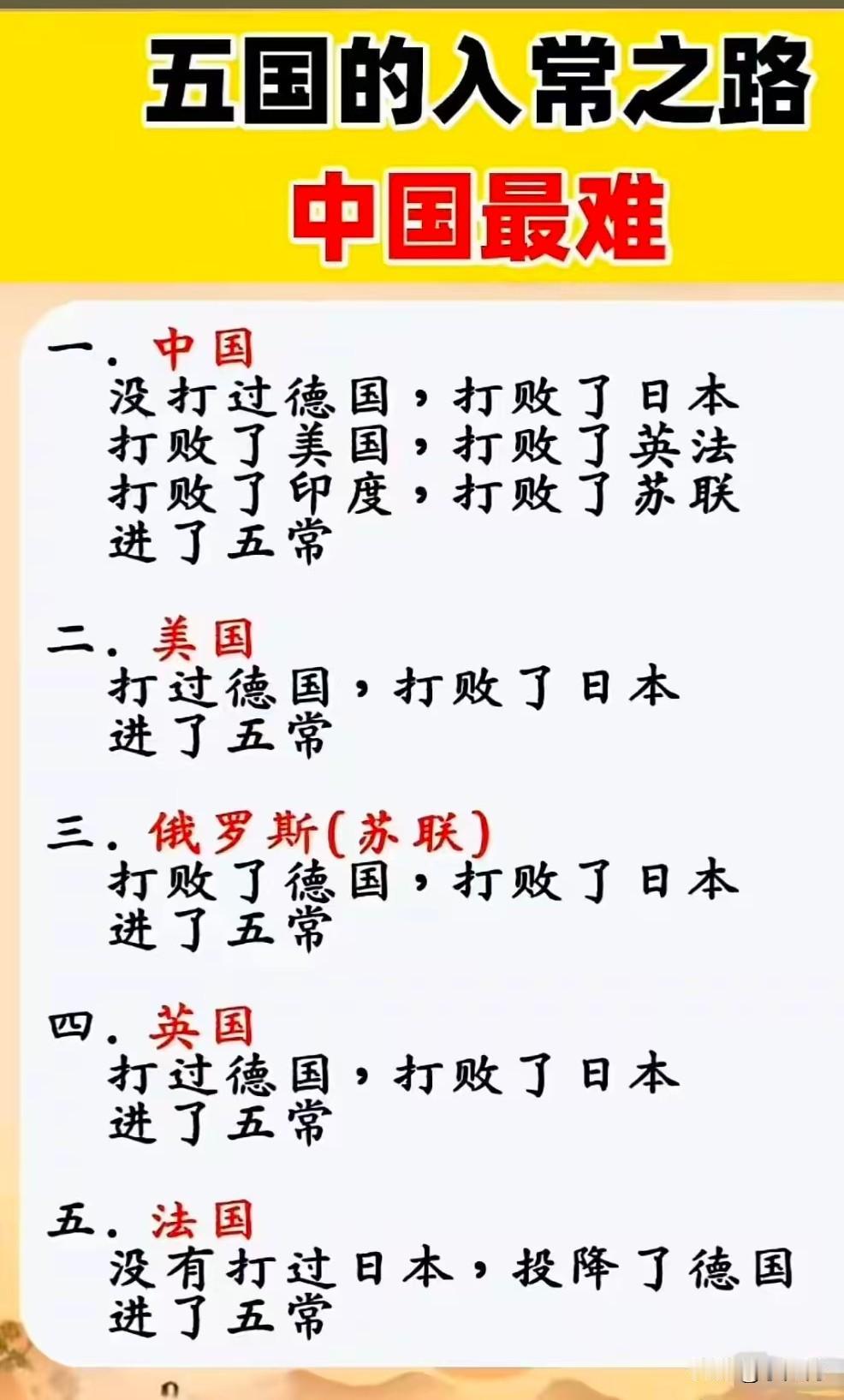 联合国五常是谁?中美俄英法 拥有“一票否决权”:全世界都同意,只要我们反对,这事就黄! 印度、日本做梦都想进,屡次申请全被拒。 网友怒怼:五常地位是打出来的,不是“让”出来的! 俄乌冲突期间,乌克兰代表发言后,请求全体起立为遇难者默哀。 美日代表立刻站起,可中国代表稳坐不动,巴西代表原本要起身,看到中国没动,马上坐下。联合国秘书长尴尬得半蹲着,场面一度安静。 一小时后,俄罗斯代表也提出默哀请求,这次,全场没人敢先动。 各国代表你看看我,我看看你,全都盯着中国方向。 直到中国代表缓缓起身,现场才齐刷刷全部站起。 这一坐一起,不是耍威风,而是大国话语权的真实体现。 中国的五常地位,从来不是谁“赏”的,更不是“让”的,是实打实用实力拼出来的! 建国第一年,我们跨过鸭绿江,和17国联军硬刚,打出几十年和平; 没核武器时,面对苏联威胁,我们咬牙坚持,绝不低头;对印自卫反击战,一战定边疆;收回香港,一寸不退! 我们还是联合国五常中,唯一公开承诺“不首先使用核武器”的国家,有力量,更有克制。 印度、日本做梦都想进五常,可光有钱不行,得有担当,更得有底气。 现在的中国,不惹事也不怕事。 在国际事务中,我们不搞小圈子,不拉偏架,说话才有人听。 别听网上某些人瞎说“中国该让位”,没点真本事,谁敢在安理会这么稳坐? 这一幕,值得我们每一个中国人记住: 大国地位,从来不是喊出来的,是干出来的。联合国 中国联合国 中国联合国地位