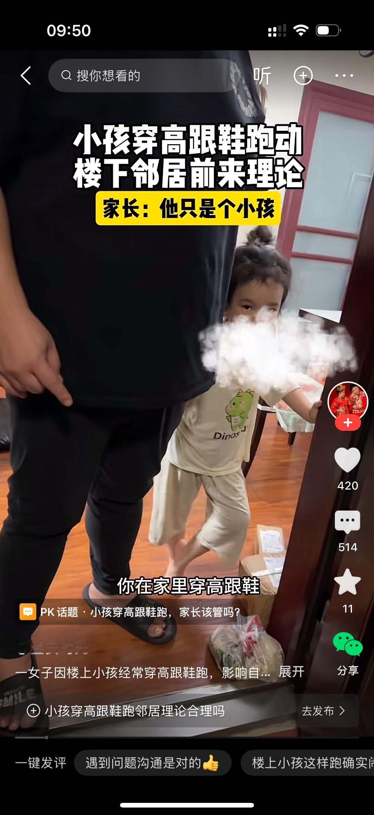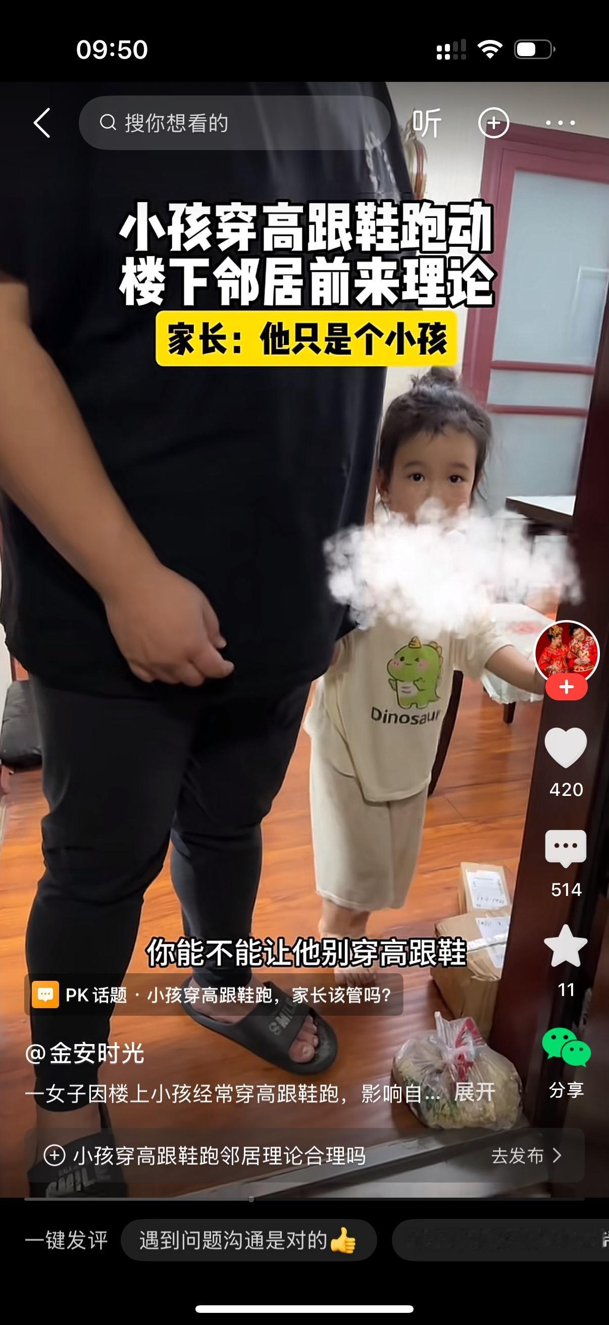 楼下邻居在睡觉,楼上一个5岁的小孩穿着高跟鞋在家里乱跑。楼下的女子实在忍受不了,跑上去理论。小孩的爷爷却说,小孩才5岁,穿高跟鞋在家里跑步没错。她只是个小孩而已。女子很生气,小孩不懂事,大人更不懂事。再这样,我就报警。爷爷却说,你不报警就是龟孙。说完,他把门关上了。