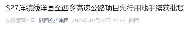 10月20日,S27洋镇线洋县至西乡高速公路项目先行用地手续获自然资源部批复。这一关键进展,为项目依法合规实现年内开工建设奠定了坚实基础。