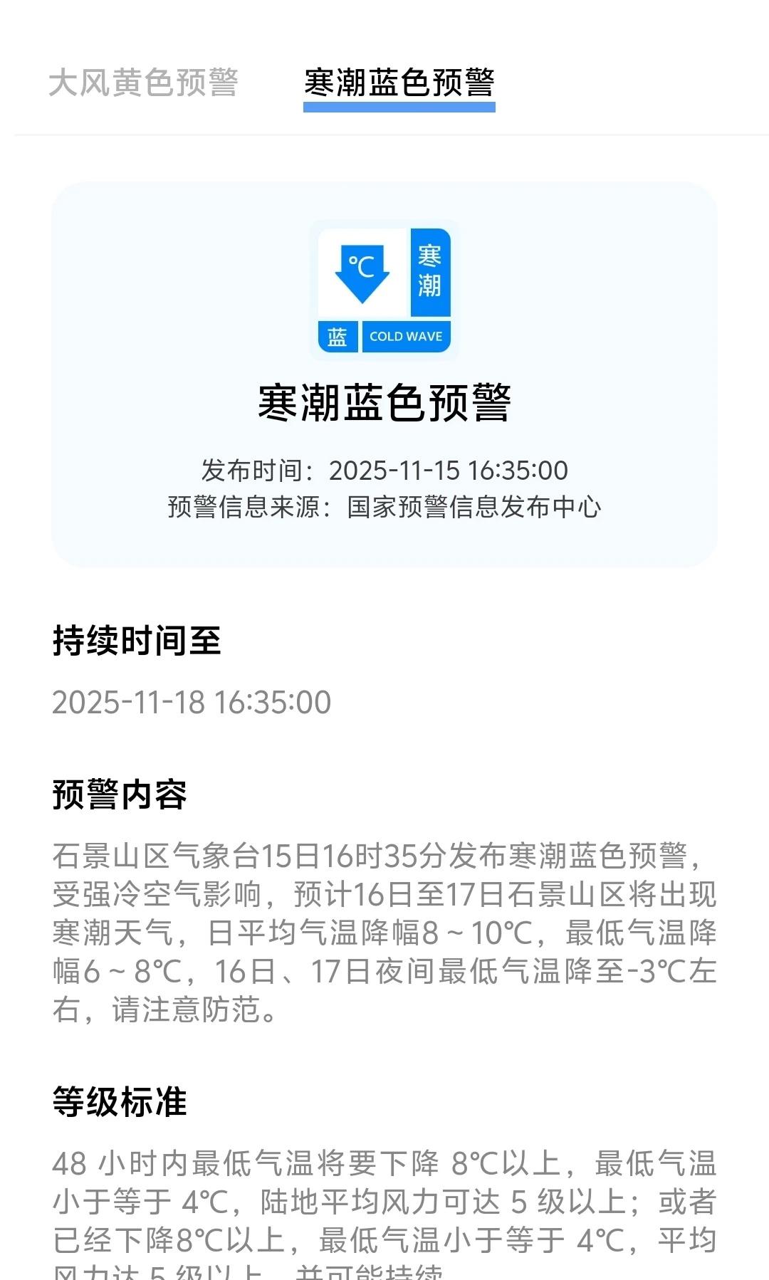 双预警杀到!寒潮+大风这波得这么防⚠️ ❄️【寒潮蓝色预警】16-17日石景山气温“跳崖式”狂降8-10℃!白天裹成熊,夜间最低直接砸到-3℃,出门分分钟冻透!👉🏻保暖buff叠满:羽绒服+加绒裤+雪地靴安排上,老人小孩别忘备暖手宝;家里暖气管道提前检查,水管裹好防结冰!🌪️【大风黄色预警】今天白天全市7-8级阵风狂吹,山区直接飙到10级“妖风”!阳台花盆、窗外杂物赶紧收,出门帽子口罩焊牢别被吹飞!👉🏻户外避雷:远离广告牌、枯树、临时围挡,骑车党尽量改步行,避免被阵风带偏!📌紧急提示:这两天降温+大风双重夹击,能宅家就别出门!通勤党揣好暖宝宝,进门先喝热姜茶缓一缓~注意防寒保暖 降温 大家注意保暖