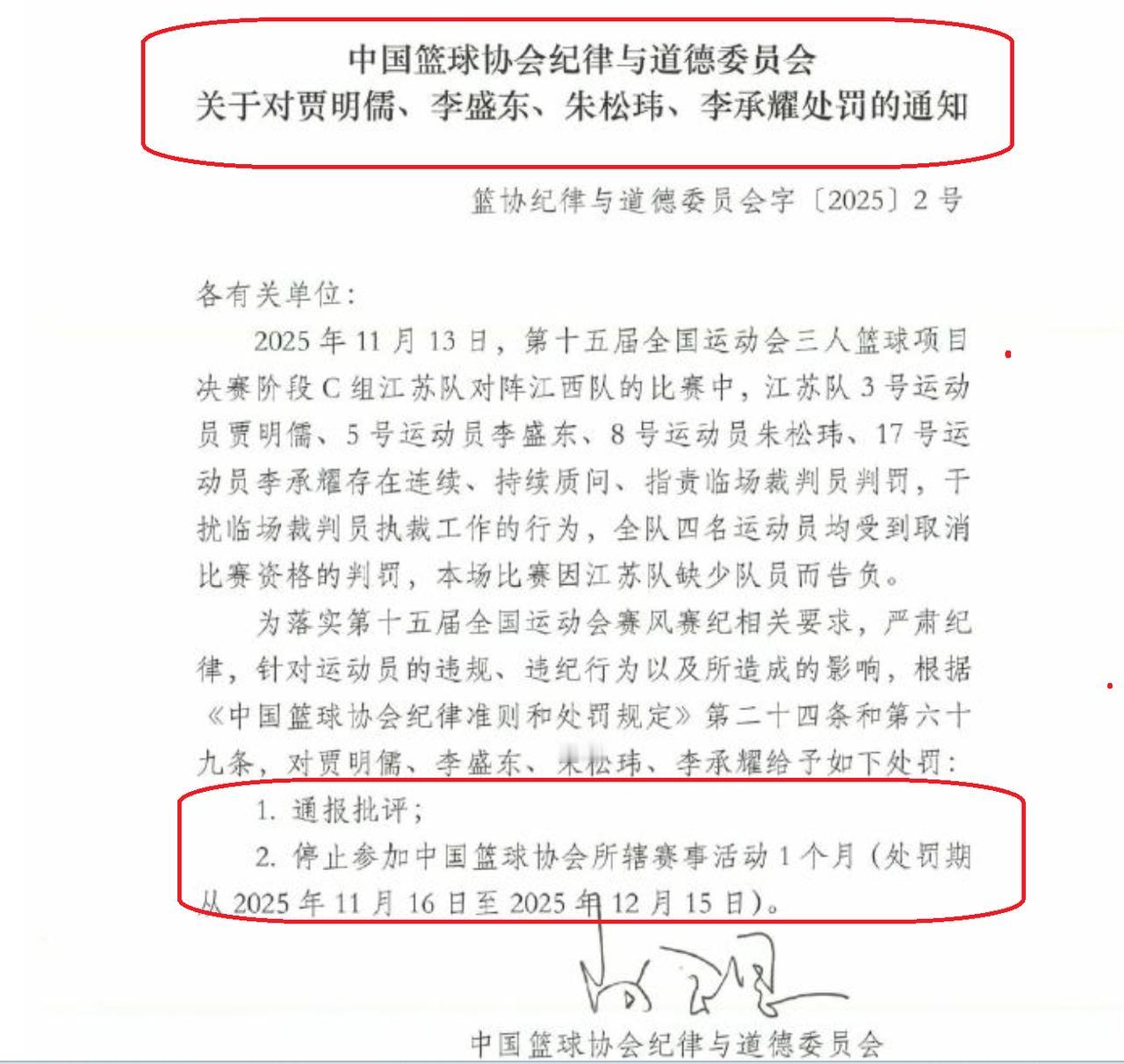CBA联赛还没有开打,中国篮协却先发出了重磅罚单,四名球员禁赛1个月!篮球名记直言:相对比赵睿的外罚,此番处罚4人禁赛一个月,太重了…… 第十五届全运会三人篮球项目,在C组江苏队对阵江西队的比赛中,发生了一件十分严重的事情,那就是江苏队队员朱松玮、贾明儒、李盛东、李承耀四名球员,因为持续质问、指责临场裁判员判罚,从而造成了严重干扰执裁工作,对于上述四人的行为,当值裁判员,也是十分果断,当场对四人进行了夺权判罚。就这样,江苏队队员贾明儒、朱松玮、李盛东、李承耀被驱逐出场,比赛直接判负。 在昨天晚上9点钟,中国篮协正式公布了重磅罚单,对江苏队队员朱松玮、李承耀、贾明儒、李盛东等四人进行了通报批评,与此同时,还对此四人进行了禁赛1个月的处罚。处罚期自2025年11月16日至2025年12月15日,他们停止参加中国篮球协会所辖赛事活动! 随着中国篮协处罚通知一出,也是引起了很多球迷讨论,其中,CBA知名篮球记者付政浩也是谈到了自己的看法,他认为篮协的此次处罚太严重了,处罚“失衡”! 付政浩表示,上赛季,新疆队球员赵睿,在新疆队主场比赛中,对当值裁判提出了严重的质疑,并且,他还有身体冲撞裁判的行为,当时,赵睿只是被停了五场比赛。而,此番篮协对江苏队四名球员,却要禁赛一个月,显然,这样的处罚标准不一致。 与此同时,付政浩还调侃道,“口头质疑裁判就禁赛一个月,反观 ,身体冲撞却只禁赛五场,那么,是否意味着以后能动手,就别吵吵了?” 不过,话又要说回来,付政浩看似很有道理,但是,双方的比赛场上,比赛性质,以及比赛的规模都是不一样。所以,标准也会不一样。毕竟,全运会四年一次,赛事主办方为了维护赛会秩序,进行抓典型案例,从而执行更为严厉的处罚,似乎也是合情合理。各位看官,您说呢?