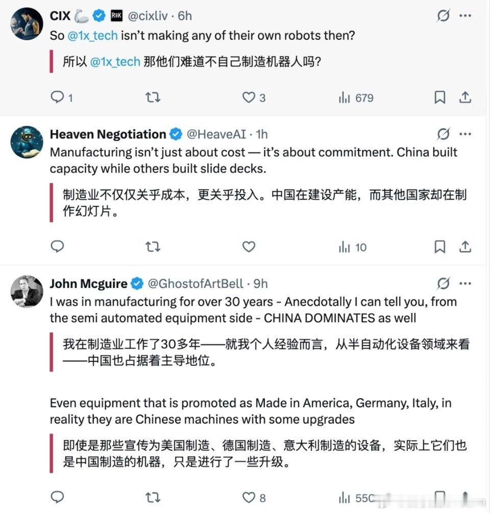 美国专家:全世界所有机器人零部件都将在中国制造,中国现在生产的机器人比美国、德国、韩国、日本加起来还要多,中国在建设制造业的产能,而其他国家制造的是幻灯片。