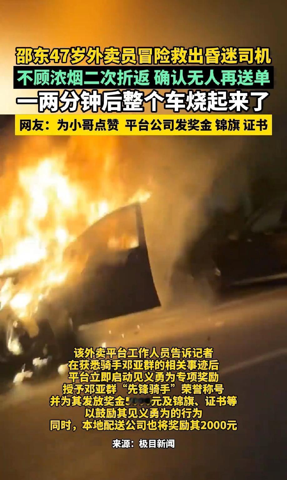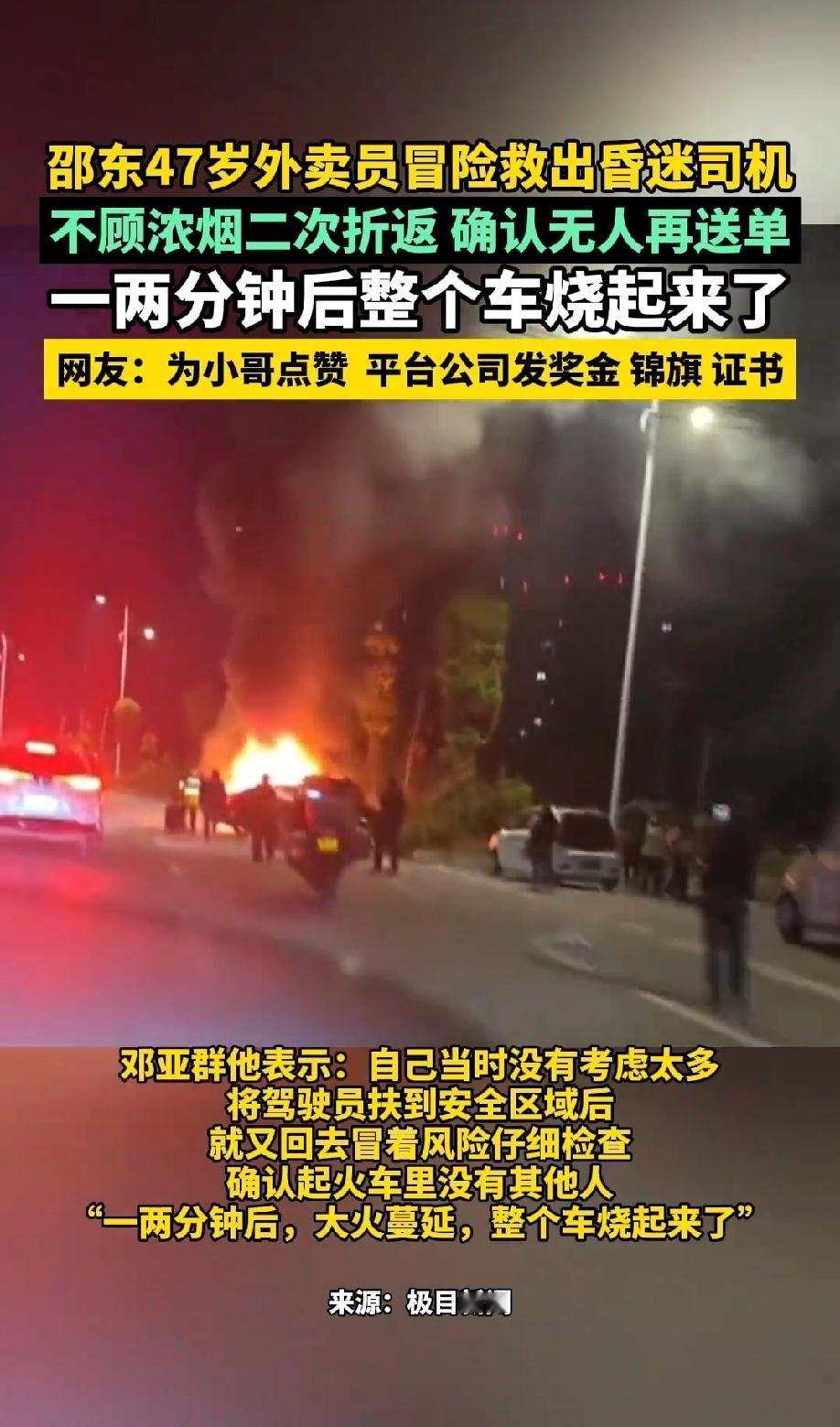 湖南邵东,凌晨,一名47岁的外卖员正在送外卖,突然看到街头发生了一起车祸,其中一辆车很快就燃起了大火,这名外卖员来不及多想,迅速冲过去将驾驶员从车里拖到安全地带,又再次不顾危险折返回去,确认车里还有没有其他人,刚离开一两分钟,大火蔓延开来,整个车都烧了起来。 (来源:极目新闻) 11月16日凌晨的邵东街头,寒意浸透了夜色,大多数人还在睡梦中,47岁的外卖员邓亚群刚送完最后一单,骑着电动车往站点方向赶。 凌晨0时40分左右,一阵刺耳的撞击声打破了寂静,他抬头一看,前方路口两辆车撞在了一起,其中一辆车的车头已经冒出了火苗,橘红色的火光在黑夜里格外刺眼。 邓亚群没有丝毫犹豫,立刻加速冲了过去。靠近后才发现,另一辆奔驰车的车主已经坐在地上,脸上带着伤,看到他过来就急忙喊:“里面还有人!起火的车里有人没出来!” 这话让邓亚群心里一紧,他赶紧跑到起火的车旁,此时车门还能打开,但车里已经弥漫着呛人的浓烟,安全气囊已经全部爆开,挡住了不少视线。 他探头一看,驾驶员低着头靠在座椅上,不管怎么呼喊都没有回应,显然是昏迷了。 浓烟呛得他忍不住咳嗽,火苗已经开始往上窜,烤得脸颊发烫,但邓亚群没时间多想。 他一把抓住驾驶员的手臂,发现对方身上系着安全带,又赶紧伸手去解安全带卡扣,慌乱中手指被蹭得生疼也顾不上。 解开安全带后,他用尽全身力气,把昏迷的驾驶员从驾驶座上拽了出来,一步步扶到路边的安全地带。 安置好司机后,邓亚群回头一看,火势已经比刚才大了不少,浓烟顺着车窗往外涌。 但他突然想起,万一车里还有其他乘客呢?这个念头让他立刻转身,再次冲进浓烟里。 他屏住呼吸,快速检查了驾驶座、副驾驶和后排,确认车里只有刚才救出来的那一位司机后,才赶紧退了出来。 就在他刚回到安全地带一两分钟的功夫,整个车身就被大火吞没了,火焰越烧越旺,噼里啪啦的燃烧声听得人心里发紧。 后来邓亚群才说,当时也没考虑危险,就觉得人不能留在火里,万一晚一步,可能就救不回来了。 坐在地上缓了口气,邓亚群看了看手机,还有没送完的订单在提醒他,但他先确认了昏迷司机的状况,直到看到远处传来救护车和警车的灯光,知道救援人员快到了,才骑上自己的电动车,继续去送剩下的订单。 这件事被路过的网友拍下来发到网上后,很快就火了。 有网友说:“这才是真正的平民英雄,没有铠甲却逆行火海。” 也有网友说:“换成别人可能会犹豫,但他想都没想就救人,还二次折返确认,这份责任心太难得了。” 的确,他只是一个普通的外卖员,每天穿梭在街头巷尾,为了订单奔波,但在生死关头,他把别人的生命放在第一位,不顾个人安危去救人。 后来外卖平台授予邓亚群“先锋骑手”的称号,给了5000元奖金,他所在的配送公司也奖励了2000元,大家都觉得这是他应得的。 据了解,邓亚群平时在站点里就很和气,年纪不算小了,但每个月能送1400多单,看得出来是个踏实肯干的人。 生活里其实没有那么多惊天动地的大事,但正是这些平凡人做出的不平凡选择,温暖了整个城市。