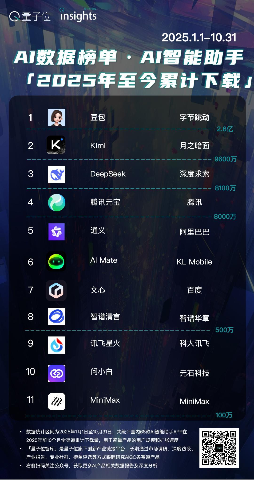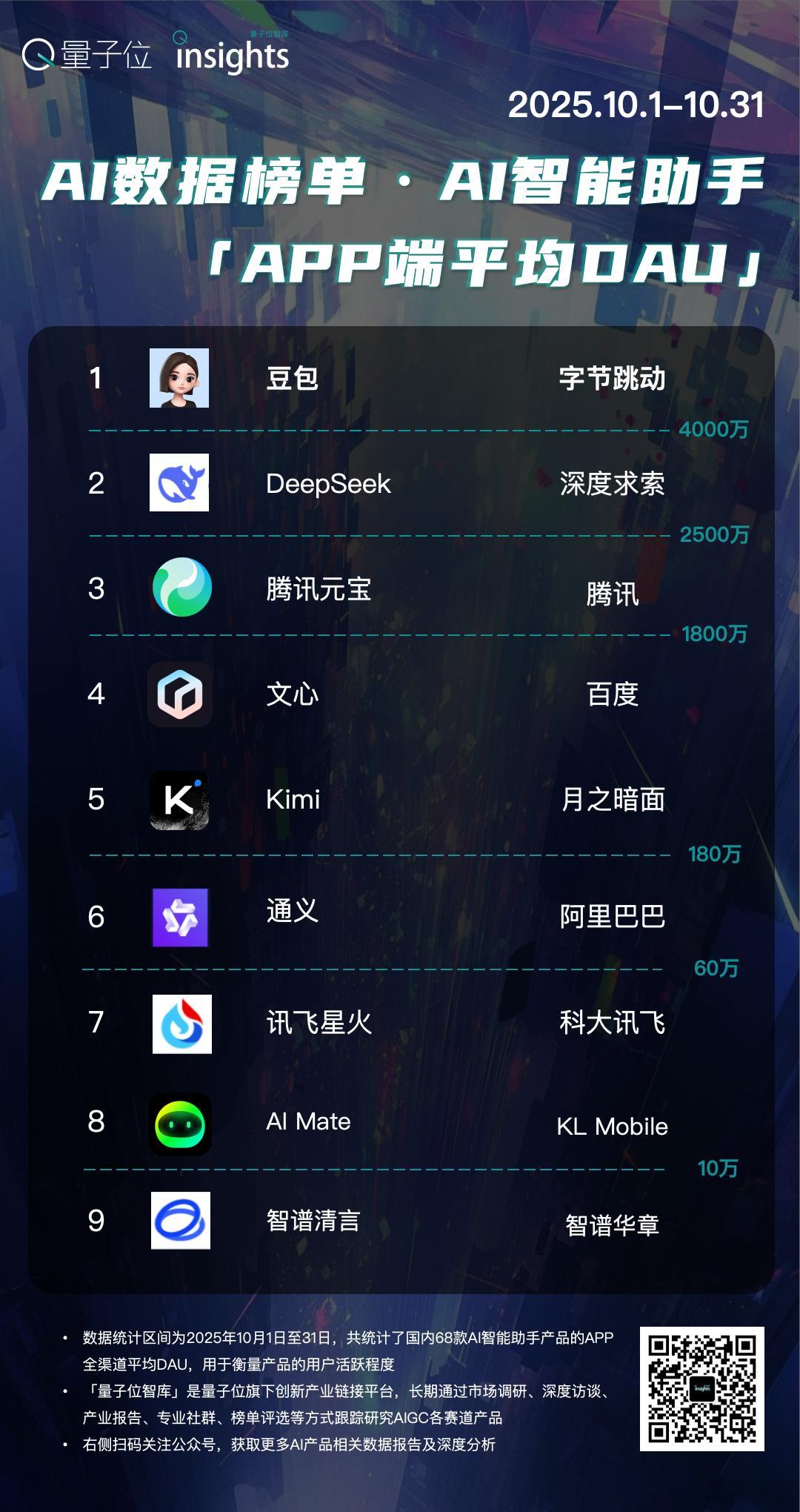AI智能助手赛道的APP产品,10月最新数据出炉。在量子位智库入库统计的60余款AI智能助手APP中,10月下载总量超过5100万,和9月数据基本持平。10月下载量过千万的APP产品依旧只有豆包和腾讯元宝两款,Kimi、DeepSeek下载量超过360万,其余产品下载量皆在百万以下。智能助手APP端10月整体日活用户达到约9000万,较9月增长超800万。平均日活排在前三的依旧是豆包、DeepSeek和腾讯元宝,DAU均超过1800万。以今年前10个月累计下载为数据基础,AI智能助手APP的总「用户规模」超过5.5亿,豆包在其中占比近5成。具体数据,依然关注的是关键维度——- APP端当月新增下载量- APP端当月平均DAU- APP端新增三日留存率- APP端2025年累计下载- 各指标增长率本文结论仅覆盖至2025年10月,期望能够从用户增长、用户活跃、用户粘性和用户规模维度提供最新参考。