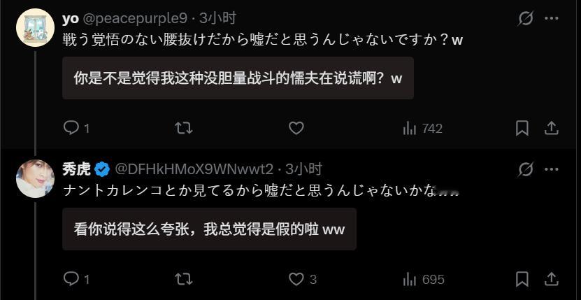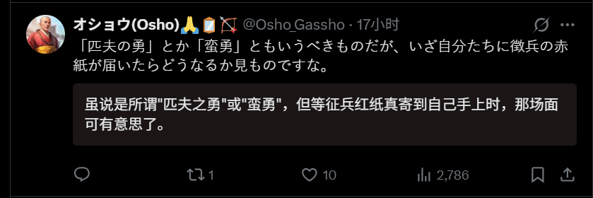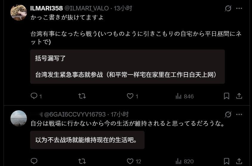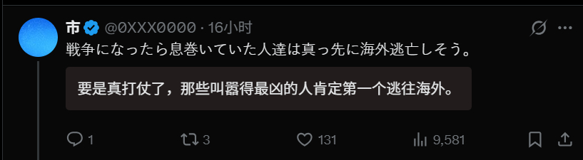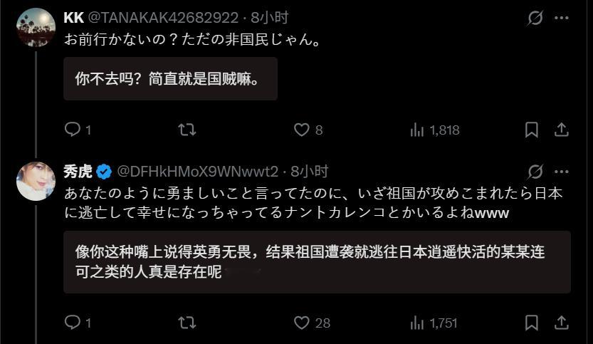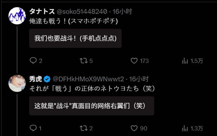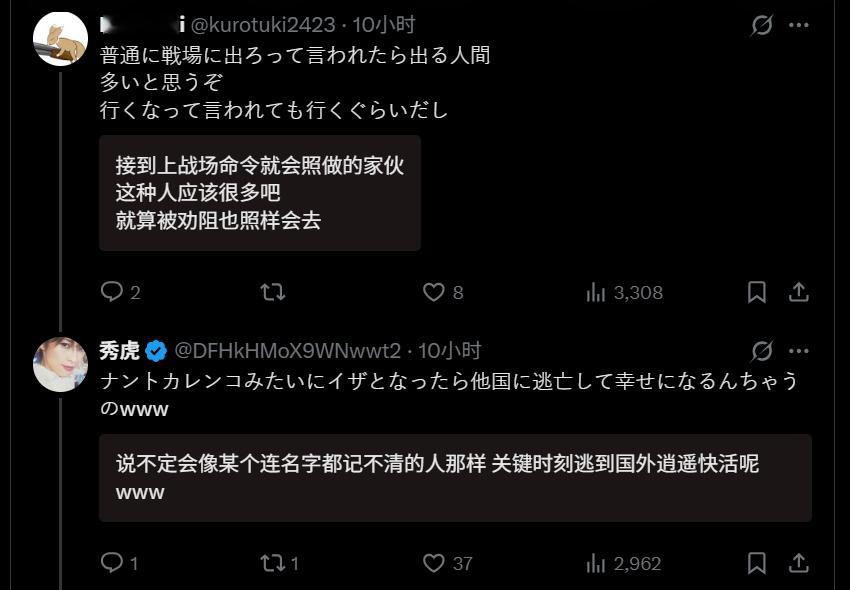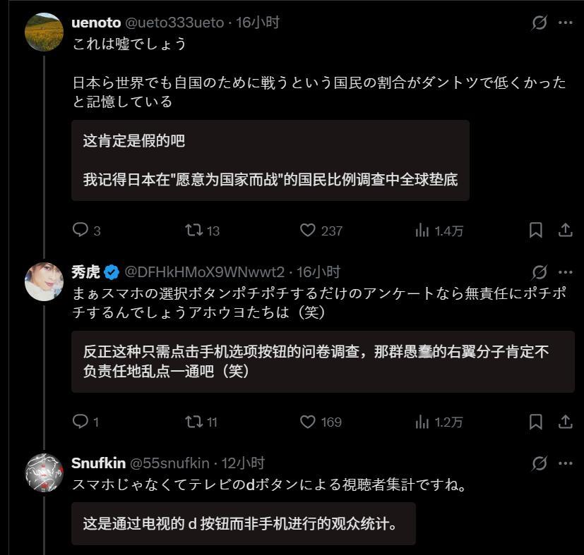 🔻网友分享:日本网民自己也不相信有那么多日本人愿意为🐸参战:🔹“胡扯。不就是一群宅在家里的键盘军事家嘛笑死。”🔹“我们也要战斗!(手机点点点)”🔹“这肯定是假的吧,我记得日本在"愿意为国家而战"的国民比例调查中全球垫底。”🔹“反正这种只需点击手机选项按钮的问卷调查,那群愚蠢的右翼分子肯定不负责任地乱点一通吧(笑)”🔹“要是真打仗了,那些叫嚣得最凶的人肯定第一个逃往海外。”🔹“你是不是觉得我这种没胆量战斗的懦夫在说谎啊?w”🔹“右翼认为‘🐸发生紧急事态就参战’=‘和平常一样宅在家里在工作日白天上网’。”🔻总结的还挺生动的。