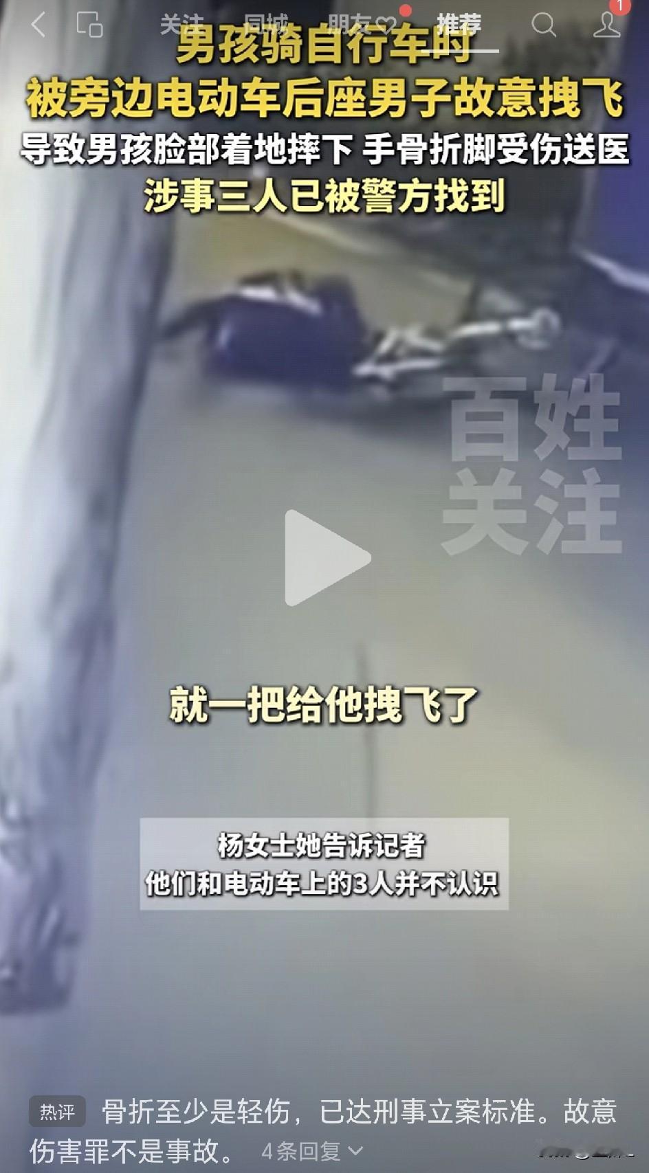 “飞车”伸向孩童的“恶魔之手”!湖南醴陵一男孩在家门口骑车被陌生男子故意拽倒,手部骨折。警方已介入! 11月12日晚,湖南醴陵,一名男孩在自己家门口骑车时,一辆途经的电动自行车上,后座男子伸手将男孩故意拽倒。 没有防备的男孩,被直接从自行车上拽下来,脸朝下摔倒了地上。受伤的男孩被家人送到了医院,检查发现全身多处受伤,其中手部骨折。 男孩母亲在查看监控后,怀疑三人是故意拽倒男孩,导致男孩受伤。 11月14日,警方确认了涉事三人身份,并组织双方家长在派出所会面,目前案件正依法处置。 朗朗乾坤,青天白日,如此恶劣行为着实让人感到非常震惊和愤怒。 这种无缘无故、针对无辜儿童的恶意行为,不仅给男孩造成了身体上的伤害,更会带来巨大的心理创伤。 这三人,从警方需要双方家长会面来看,应该属于未成年人。但未成年人,从来也不是免死金牌。 男孩手部骨折,全身多处受伤,经济赔偿是必不可少,警方会根据男孩伤情来判定他们应当承担的行政处罚。 明知自己的行为会给别人造成伤害,依然任性为之,这样的行为极其恶劣,社会影响也很坏。 对于三人这样的行为,必须一定要严肃处理,给受害男孩及其家庭一个公正的交代。 因为这不仅是对一个受害家庭的补偿,也是对社会正气和法治尊严的维护。 信息来源于百姓关注,侵联删! 带定位晒今日生活 我的今日状态:😁轻松愉快 我这里的天气:☀️晴天