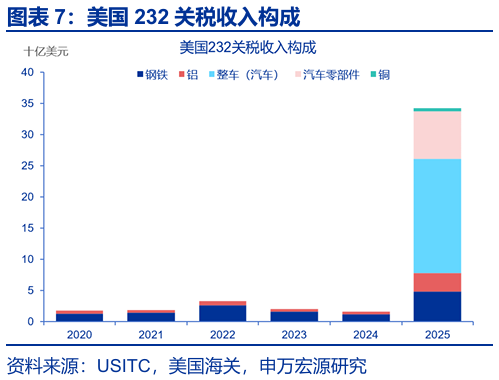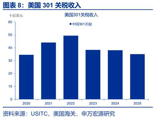 美国关税收入格局中,对等关税占45%,301关税占18%,232关税占17%,基础关税占19%。2025财年,对等关税收入890亿美元,其中全球基准对等关税516亿,对华芬太尼关税289亿;301关税351亿,均为对华征收所得;232关税共342亿,其中汽车及零部件关税259亿。