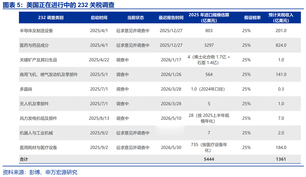 若对等关税失效,特朗普或切换至232、301及338条款加征关税,短期内或用122条款的全球关税过渡。美国现有9项正在调查中的232关税,覆盖进口规模5444亿,多数于明年上半年提交报告。338条款可最高加征50%关税,但历史上未曾使用,存在新的法律风险。