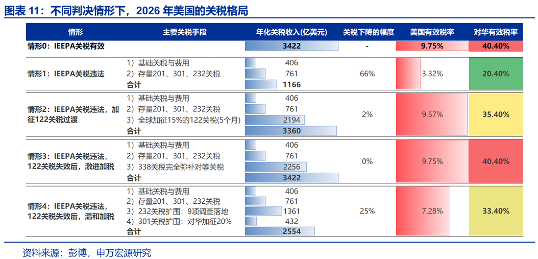 情形2:若IEEPA对等关税被判全面违法,美国使用122条款对全球加征15%关税进行过渡,持续150天。在此期间,美国有效关税税率可维持在9.57%,对华关税税率35%,年化关税收入维持在3360亿美元,与IEEPA关税效果较为接近。