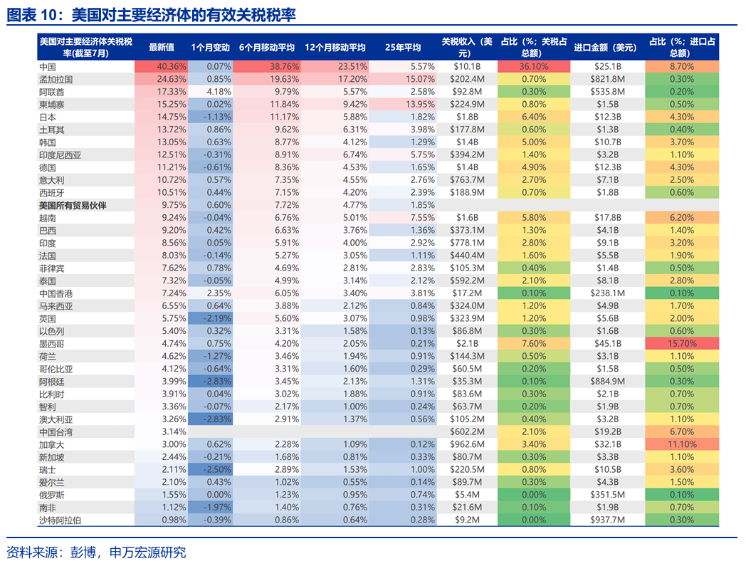 美国平均关税税率9.75%,对华有效税率最高,对中国商品征收的关税占总关税的比重最高,达36%。截至7月,美国对全球平均关税税率为9.75%,其中对中国关税率为40.4%,美国对孟加拉国关税税率24.6%,阿联酋17.3%,日本关税14.8%,韩国13.1%,德国11.2%,意大利10.7%,越南9.24%。从关税收入来源国看,中国贡献了关税总额的36%,墨西哥占关税总额的7.6%,日本占6.4%。