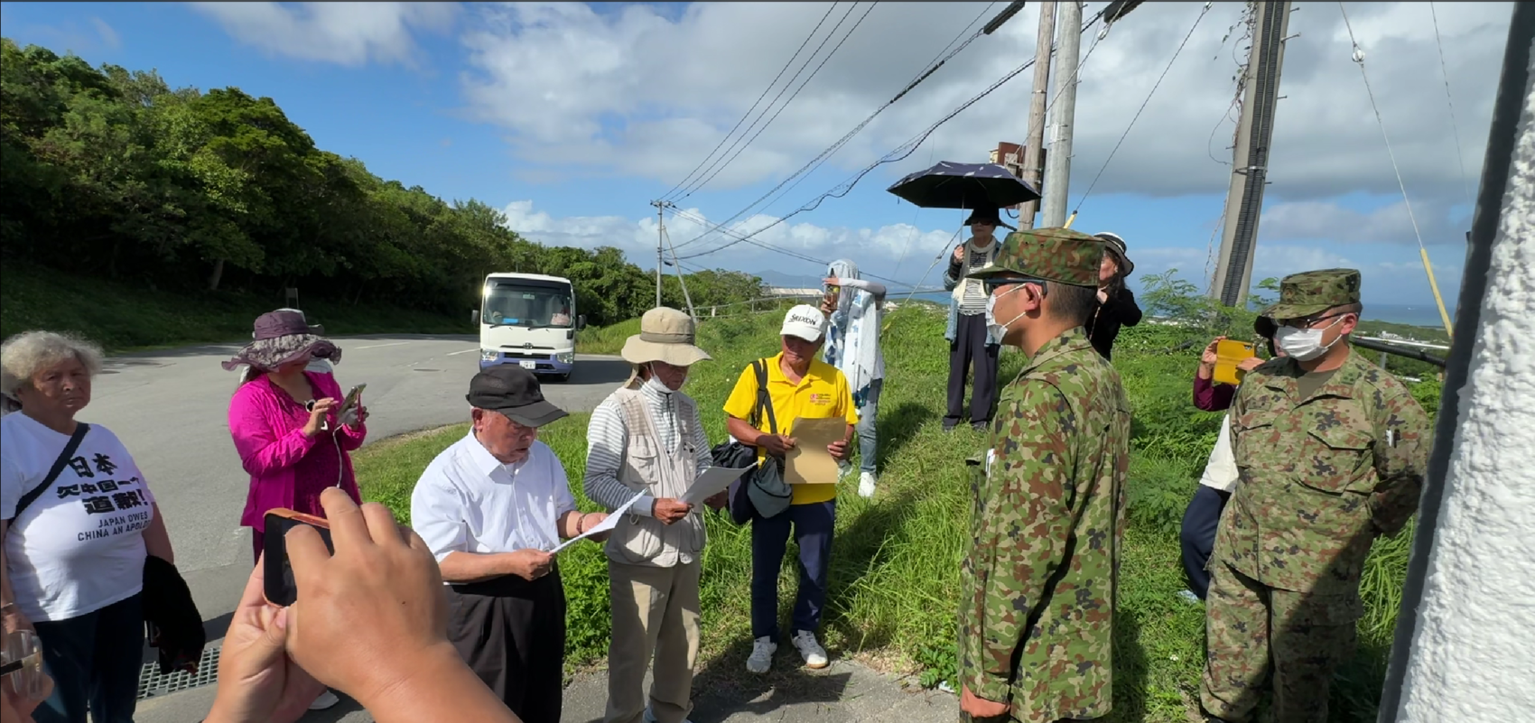 访问团成员和冲绳当地反战人士前往日本自卫队冲绳驻地,向日本政府递交声明,要求道歉、赔偿,并承诺“中日永不再战”。受访者供图