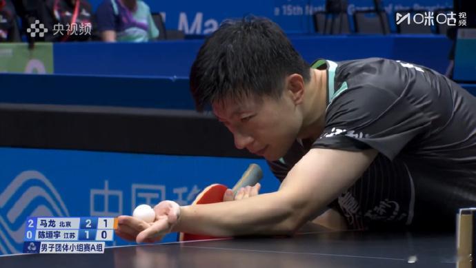 第十五届全运会乒乓球男团小组赛北京队对阵江苏队的比赛中,马龙 所在的北京队3:0战胜江苏队。黄友政/马龙3-2曹彦涛/陈垣宇【8-11、11-7、11-6、4-11、11-9】王楚钦3-1孙闻【6-11、11-3、11-5、11-8 】 马龙3-1陈垣宇【11-3、11-2、5-11、13-11】