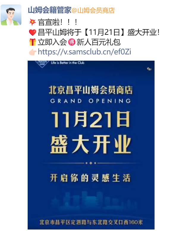 备受期待的北京昌平山姆会员店终于定档!近日,北京商报从山姆会籍管家处获悉,昌平山姆会员店将于11月21日开业。