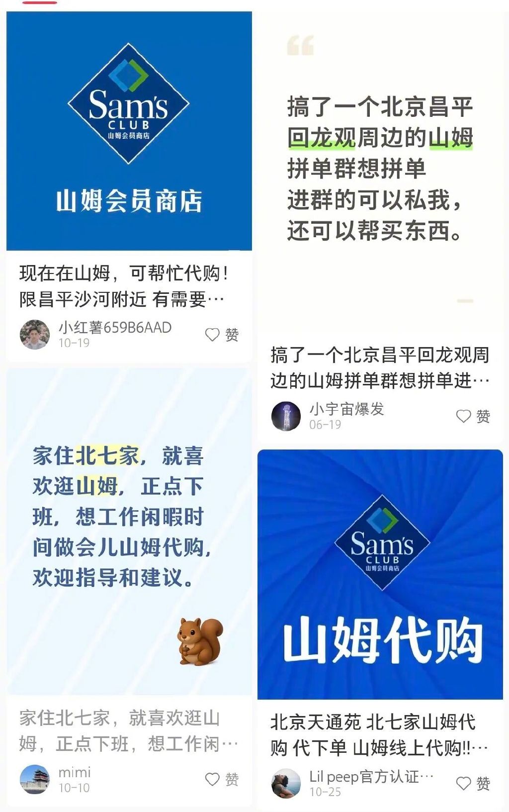 此外,昌平区山姆还吸引了大批代购的关注。早在10月,已有账号发文称家住北七家,可做昌平山姆代购。开业时间官宣后不久,就有代购发布优惠信息并组建群聊,吸引消费者进群。关于代购价格,有代购称收总额5%手续费,有的代购则称每单收费5-10元。