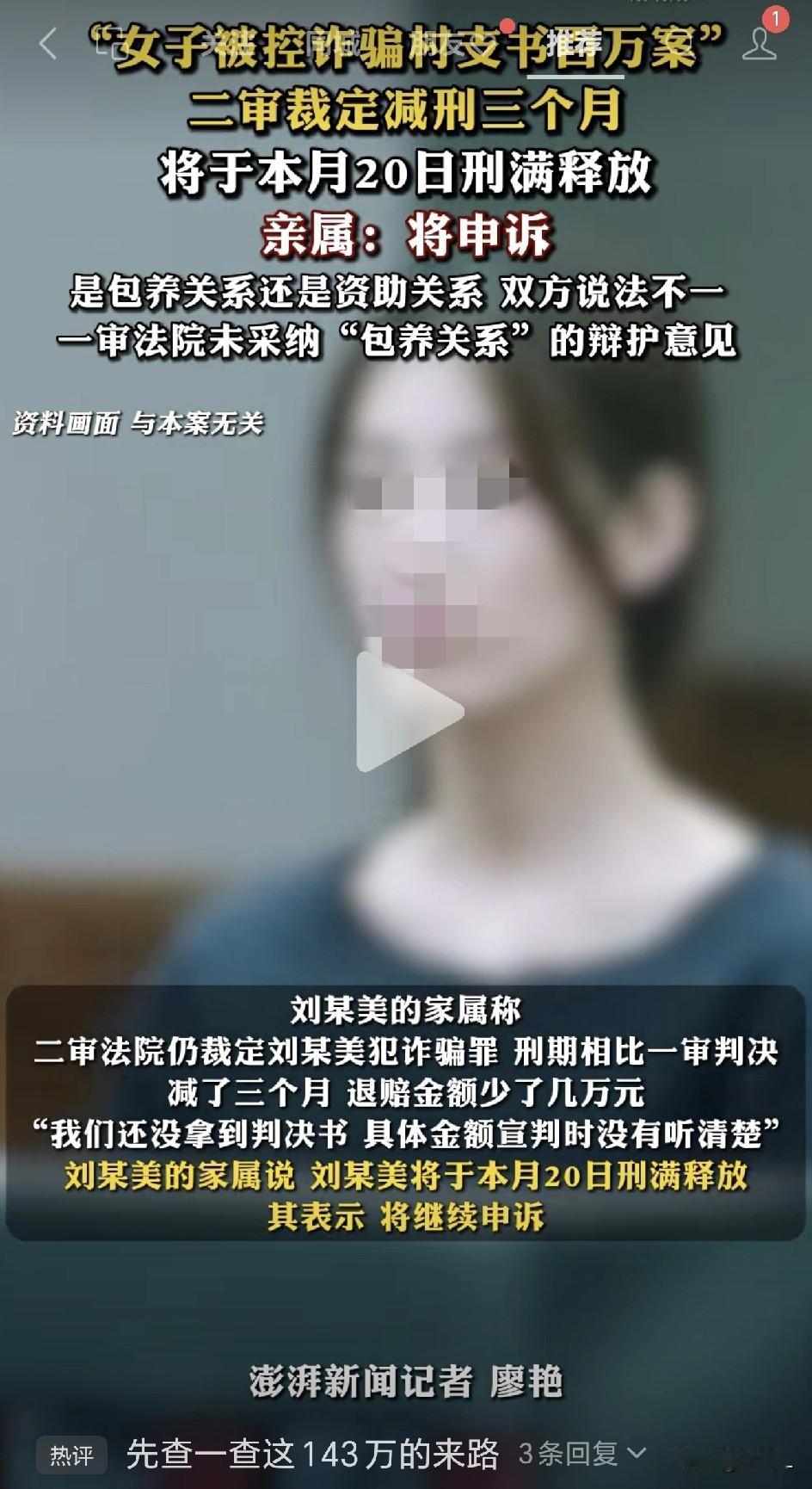 “包养”or“诈骗”?一场“图财图色”交易的罗生门!女子因骗百万入狱,那给出百万的支书呢? 11月14日,山东临沂中院,对“女子被控诈骗村支书百万案”二审宣判。被告刘某美刑期由5年改判为4年9个月,减刑3个月,将于11月20日刑满释放。 据悉,1997年出生的刘某美,在2016年与兰陵县某村原支书胡某银相识。 2020年,胡某银以被刘某美诈骗为由,将刘某美告上了法庭。胡某银称,刘某美冒充学生,隐瞒自己已经辍学并婚育的事实,以学费、医药费等名义索要143万余元。 而刘某美则称自己和胡某银是包养关系。 2023年7月7日,兰陵县法院以诈骗罪判处刘某美5年有期徒刑,责令退赔41.38万元。 2025年11月14日,临沂中院维持诈骗罪认定,减刑3个月,退赔金额减少(具体未明确),刑期至11月20日结束。 法院认定刘某美虚构学生身份、医疗需求等骗取钱财,现有证据不足以证明包养关系。 刘某美家属表示将继续申诉,强调案件存在证据链瑕疵及司法程序争议。 也就是说,刘某美的家人认定胡某银与刘某美就是包养关系。就像网友所说,“我想知道刘某美的家人到底是怎么想的?” 也有网友说,“有些人在金钱面前,礼义廉耻一文不值!” 这个案子看上去是一场因扭曲的欲望而导致的悲剧,双方都付出了沉重的代价。 但更多的人在质疑公职人员的廉洁问题,一名村支书随随便便就能花给外人一百多万,当村支书能挣这么多钱的吗? 不论这一对男女的关系究竟如何,暂不论,但有一点网友说的非常准确,“女的图财,男的图色!” 这是对双方动机最直白的概括。无论法律关系被认定为诈骗还是包养,其本质都是一场建立在非常规利益交换上的关系。女方通过提供情感、青春或性来换取经济利益,男方则利用经济优势来换取这些。 而公众对村支书143万巨款来源的质疑合情合理。 此案不应止于对刘某美的判决,相关部门应该介入对胡某银的财产来源进行彻底调查。 这不仅是维护法律公正,更是对公众关切的回应。 “女子诈骗村支书”只是这个故事的标题,而“村支书的百万巨款从何而来”才是这个故事真正需要被追问的结局。 只有后者得到彻查和解答,社会的公平正义感才能得到真正的安抚。