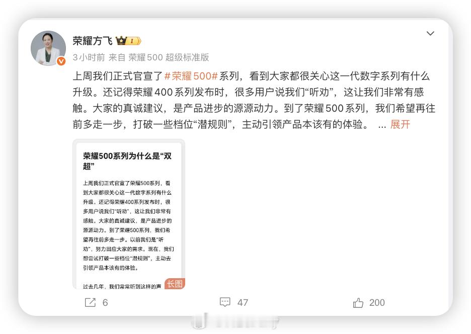 因为荣耀本身的技术积累,让荣耀500的体验远超标准版!毕竟你看荣耀,要续航有青海湖电池,要AI有YOYO,更有骁龙8旗舰芯支撑,带来了全面的产品力进阶。外观有颜值,表现超标准,是妥妥的超级标准版,并且这次荣耀也带来了“破框而出”live特效,有着丰富的特色功能,所以无论怎么看,荣耀500的表现都超越标准,带来了实打实的产品力进阶。当别人降本增效的时候,荣耀选择不断进阶,这就是荣耀式的创新和诚意!用得舒心不需要加钱,双超定位诚意满满,产品力=实力,买就对了!