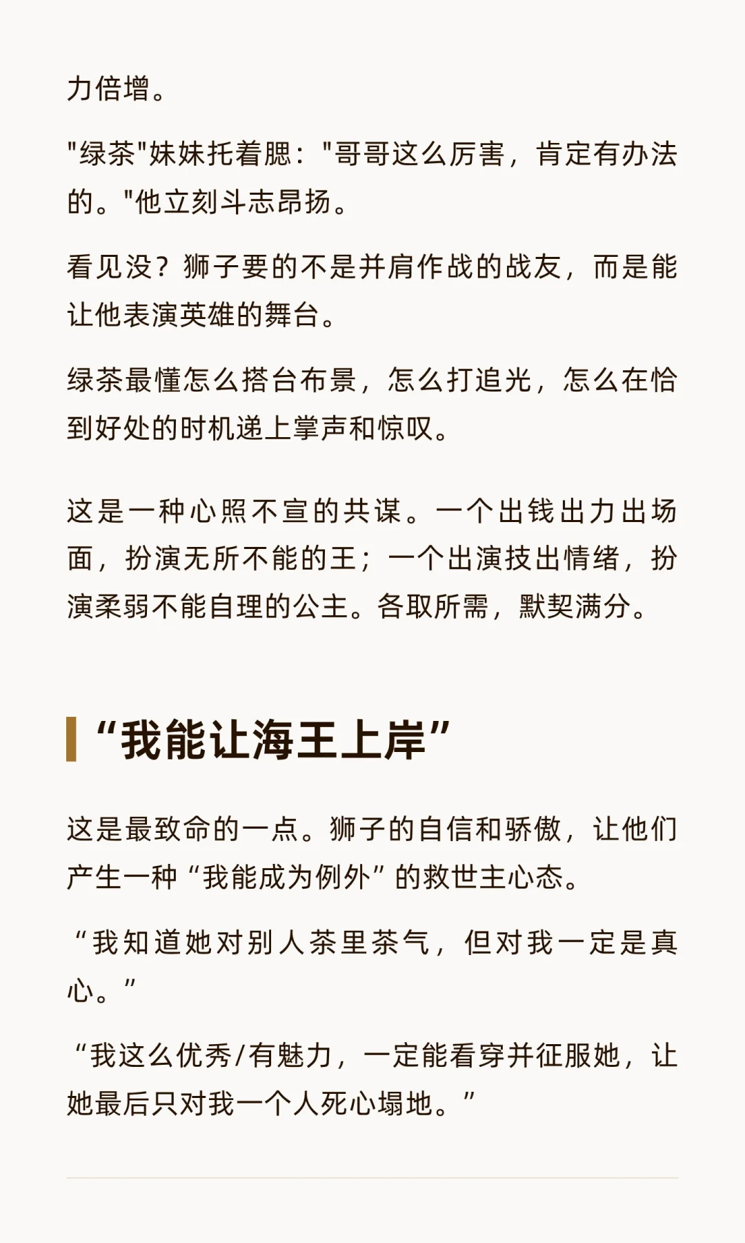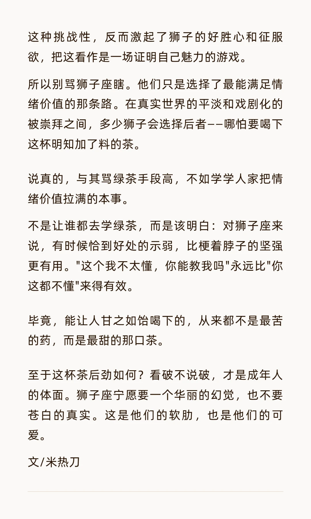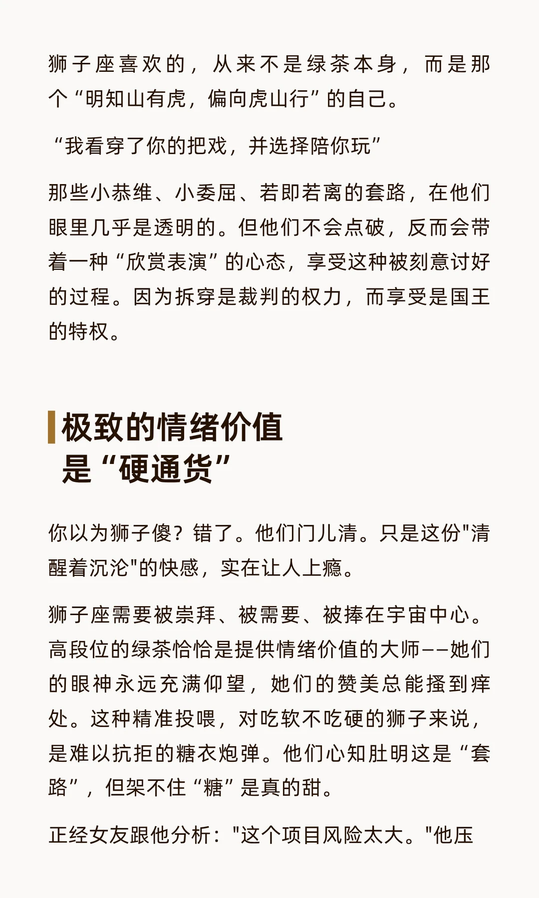 狮子座喜欢被崇拜和需要,享受被刻意讨好的过程。他们追求情绪价值,绿茶通过精准投喂和表演,满足狮子的虚荣心。而狮子座只是选择了最能被满足情绪价值的那条路。