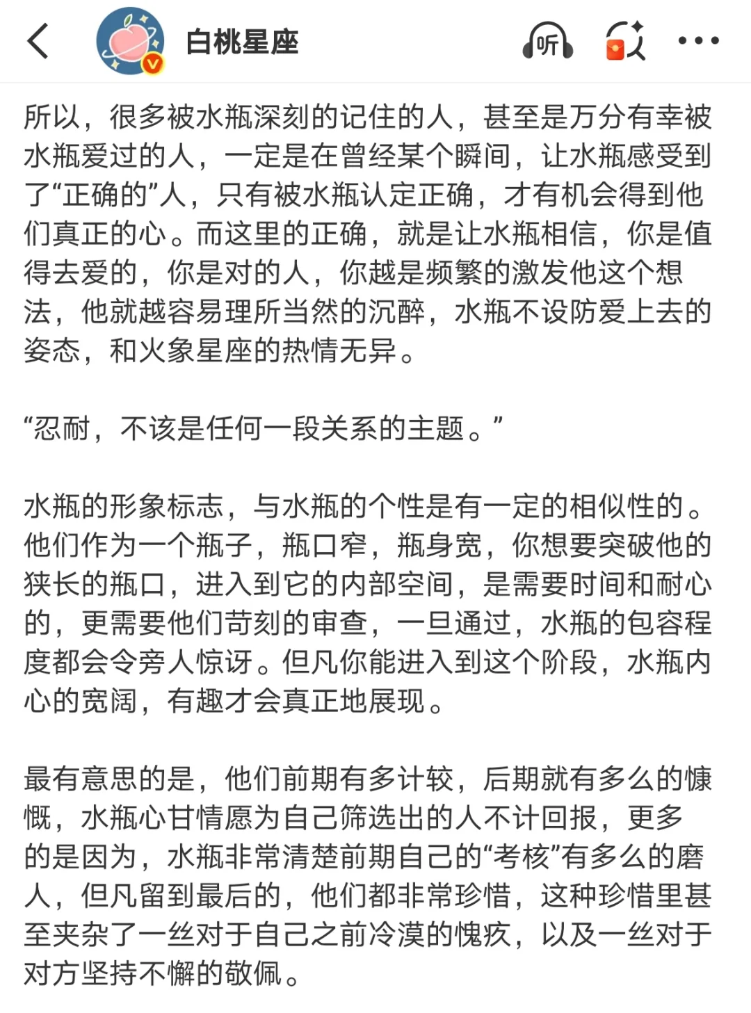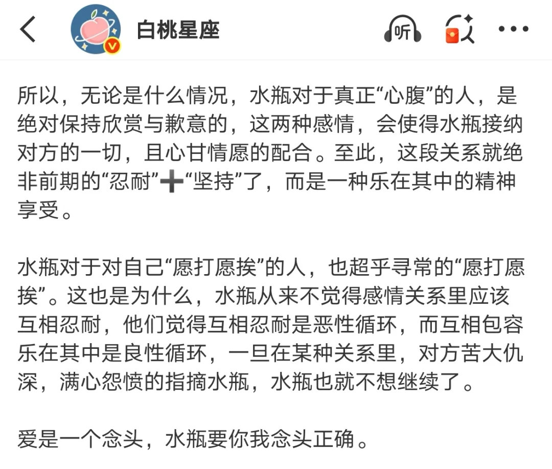 水瓶对于对自己“愿打愿挨”的人,也超乎寻常的“愿打愿挨”。这也是为什么,水瓶从来不觉得感情关系里应该互相忍耐,他们觉得互相忍耐是恶性循环,而互相包容乐在其中是良性循环,一旦在某种关系里,对方苦大仇深,满心怨愤的指摘水瓶,水瓶也就不想继续了。 爱是一个念头,水瓶要你我念头正确。