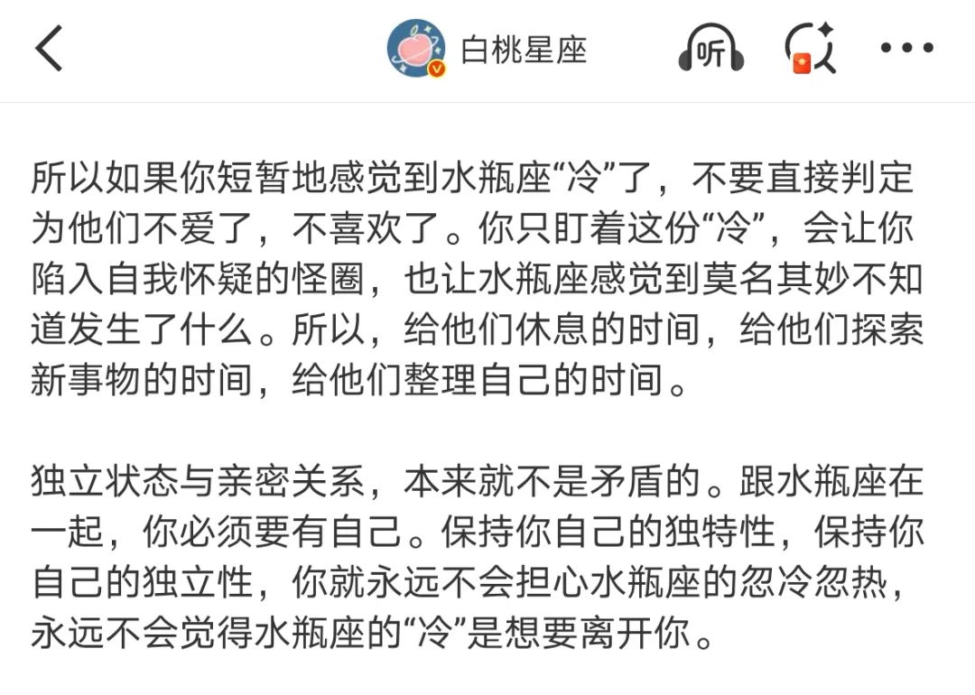 冷下来的时候,水瓶座只是回到自己的小世界,做一些自己想做的事。这和断联不同,水瓶座依旧会关心你的生活,会跟你继续分享,只是不会从早到晚,不会过分激烈。这种状态在与之前对比下显得冷漠,但其实并不冷漠,它有爱的细节在里面。