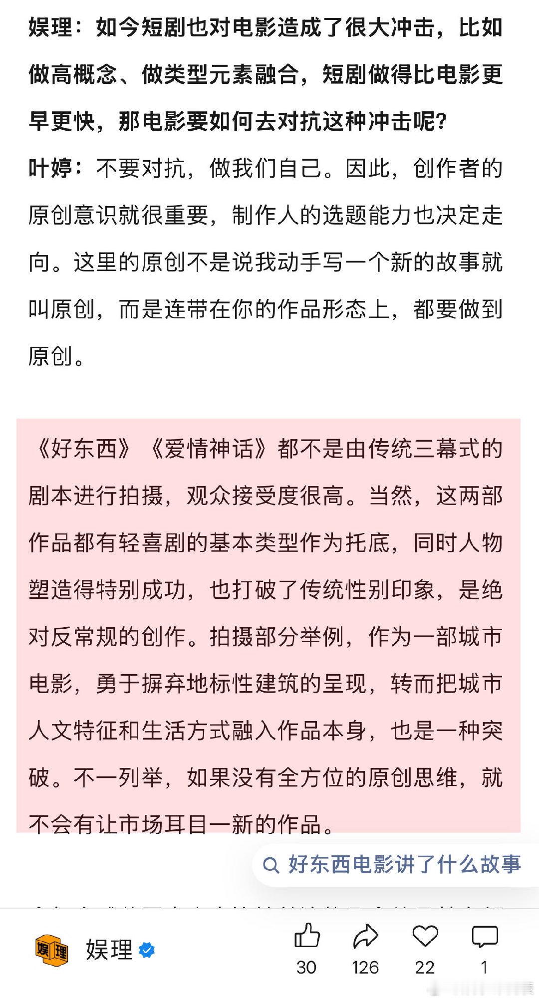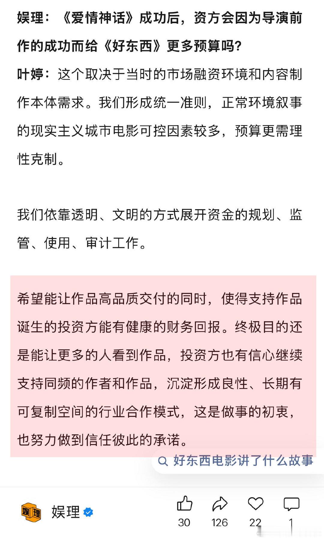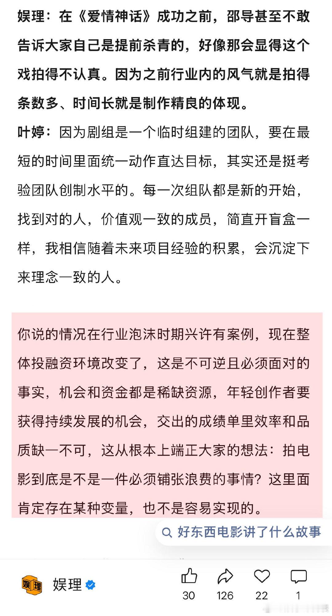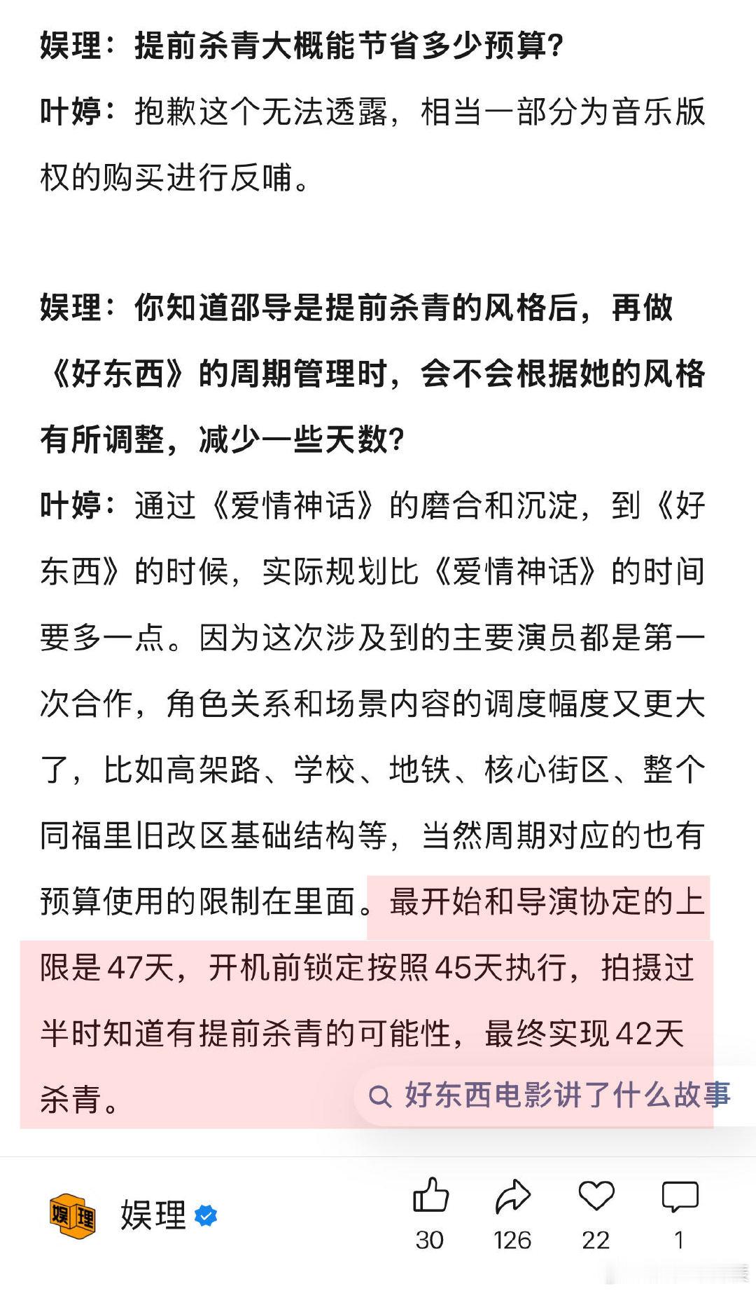 制片人谈《好东西》《爱情神话》高效拍摄、提前杀青幕后:从导演的角度一定是她对于自己想要的东西很明确,可能邵导拍三条就抓住了那个东西,她是特别准确的,因地制宜调整也迅速。她自己做剪辑指导,是带着剪辑的思维去拍,效率就高。我做整个团队的预算和周期管理时是比较理性的,也擅长吸取专业成员的建议…”↓