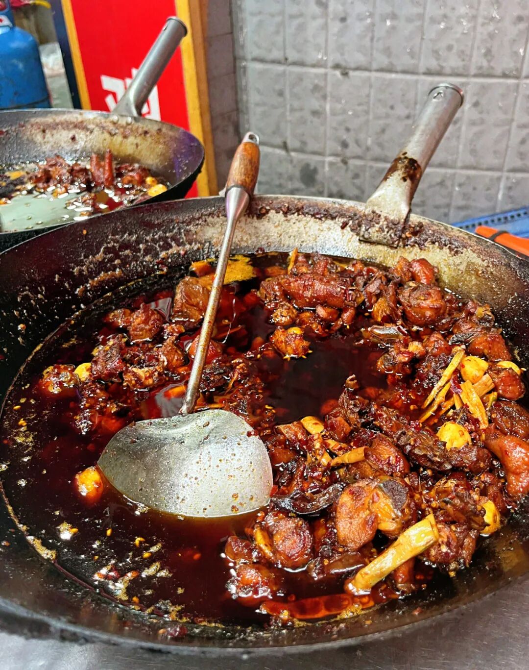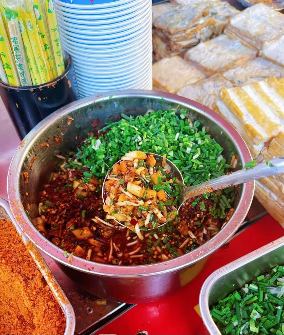 而一旁的小摊上,蛋包洋芋正在铁板上煎得滋滋作响——金黄的蛋皮包裹着绵软的土豆泥,混着折耳根和酸萝卜的脆爽,一口下去,蛋香、土豆的质朴香气和复合的酸辣在口中交融,是街头最巧妙的“包装”艺术。还有外脆内软的恋爱豆腐果、绵密香甜的洋芋粑……每一种都是风味的探险。