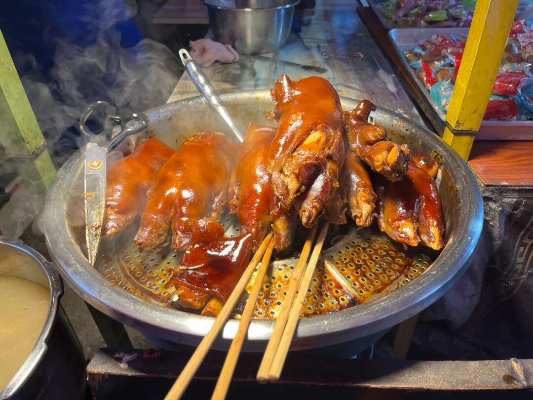 卤猪脚的浓香与玫瑰糖的清甜在微凉的空气里交织,手艺人摊前那琥珀色、透着温热的手工糖,凝结了古镇夜色中最甜蜜的片段。