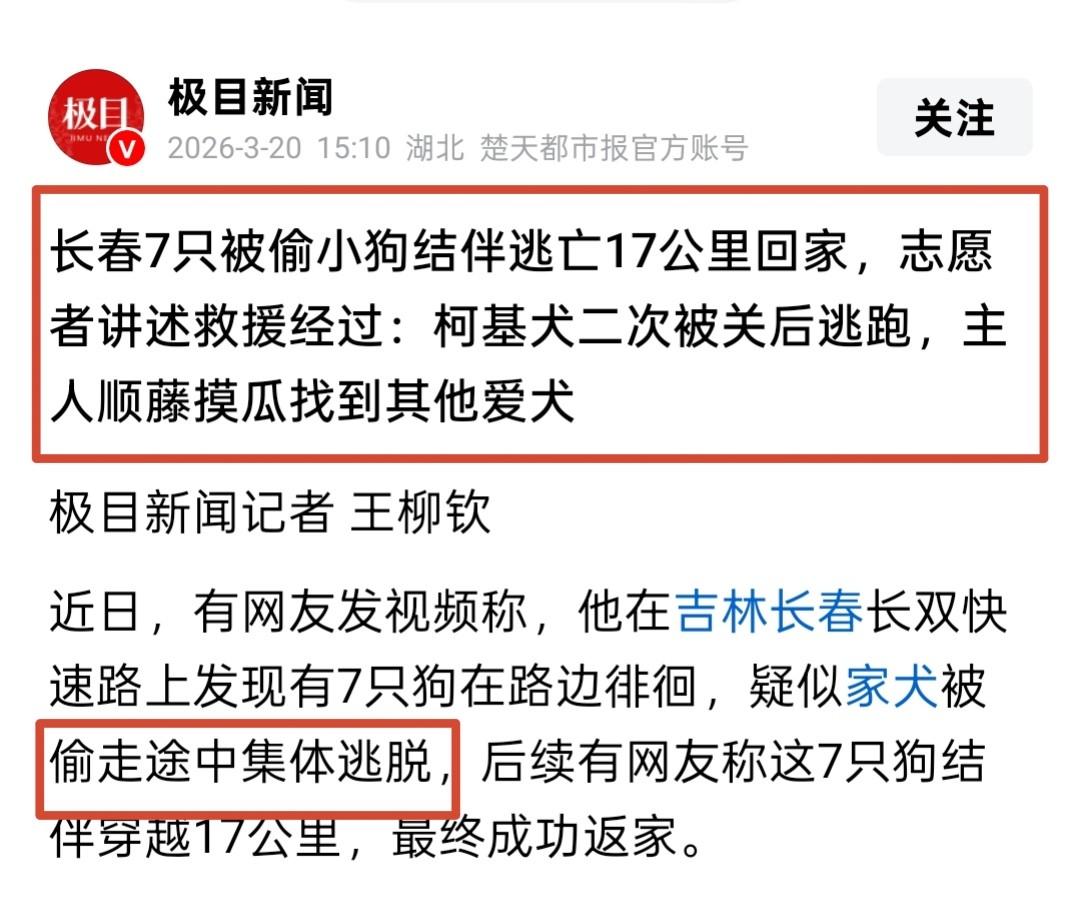 信息来源: 极目新闻3月20日发布: “长春7只被偷小狗结伴逃亡17公里回家,志愿者讲述救援经过:柯基犬二次被关后逃跑,主人顺藤摸瓜找到其他爱犬!”