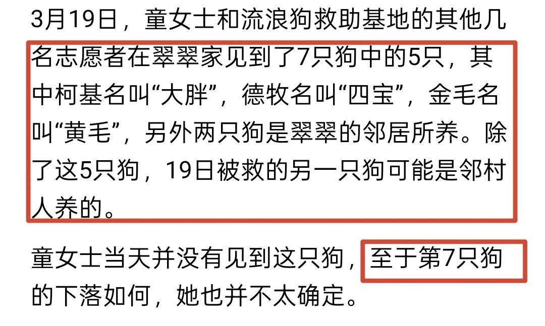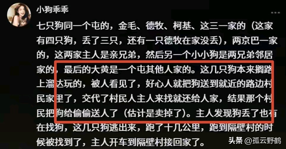 原来,这7只狗是村里三户人家养的“小伙伴”,平时总凑在一起玩耍。5天前,它们像往常一样出门溜达,被人看见了,好心人就把狗送到就近的路边村民家里了,还交代村民“主人来找就还给人家”,结果,这个村民转手就给狗狗送给别人了。