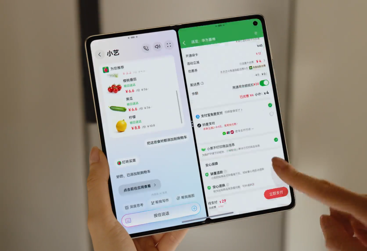 如果说超可靠折叠玄武架构是华为Mate X7的筋骨,那么HarmonyOS 6则是其灵魂。得益于首发搭载的HarmonyOS 6,华为Mate X7首次实现了A2A智能体协作的商用落地,智能体小艺从执行命令的语音助手,成为“主动理解用户意图,协同其他智能体处理复杂任务”的智能指挥官。例如,用户只需告诉小艺“叮咚买菜,我想做个低卡减脂餐”,它便能帮忙选好食材并一键下单,让用户坐等送货上门。